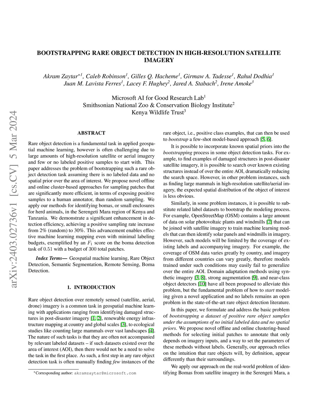 Rare object detection is a fundamental task in applied geospatial machine learning, however is often challenging due to large amounts of high-resolution satellite or aerial imagery and few or no labeled positive samples to start with. This paper addresses the problem of bootstrapping such a rare object detection task assuming there is no labeled data and no spatial prior over the area of interest. We propose novel offline and online cluster-based approaches for sampling patches that are significantly more efficient, in terms of exposing positive samples to a human annotator, than random sampling. We apply our methods for identifying bomas, or small enclosures for herd animals, in the Serengeti Mara region of Kenya and Tanzania. We demonstrate a significant enhancement in detection efficiency, achieving a positive sampling rate increase from 2% (random) to 30%. This advancement enables effective machine learning mapping even with minimal labeling budgets, exemplified by an F1 score on the boma detection task of 0.51 with a budget of 300 total patches.