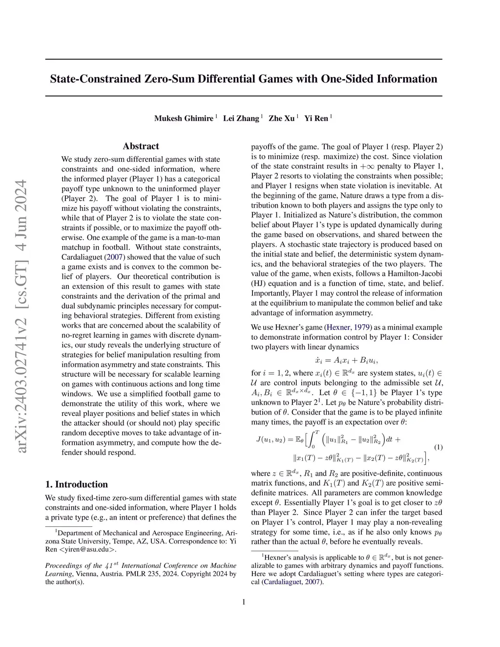 We study zero-sum differential games with state constraints and one-sided information, where the informed player (Player 1) has a categorical payoff type unknown to the uninformed player (Player 2). The goal of Player 1 is to minimize his payoff without violating the constraints, while that of Player 2 is to violate the state constraints if possible, or to maximize the payoff otherwise. One example of the game is a man-to-man matchup in football. Without state constraints, Cardaliaguet (2007) showed that the value of such a game exists and is convex to the common belief of players. Our theoretical contribution is an extension of this result to games with state constraints and the derivation of the primal and dual subdynamic principles necessary for computing behavioral strategies. Different from existing works that are concerned about the scalability of no-regret learning in games with discrete dynamics, our study reveals the underlying structure of strategies for belief manipulation resulting from information asymmetry and state constraints. This structure will be necessary for scalable learning on games with continuous actions and long time windows. We use a simplified football game to demonstrate the utility of this work, where we reveal player positions and belief states in which the attacker should (or should not) play specific random deceptive moves to take advantage of information asymmetry, and compute how the defender should respond.