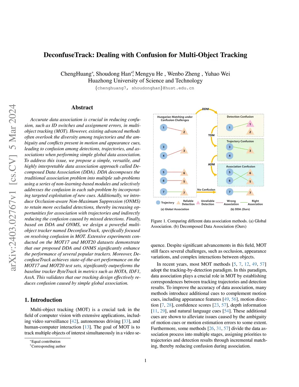 Accurate data association is crucial in reducing confusion, such as ID switches and assignment errors, in multi-object tracking (MOT). However, existing advanced methods often overlook the diversity among trajectories and the ambiguity and conflicts present in motion and appearance cues, leading to confusion among detections, trajectories, and associations when performing simple global data association. To address this issue, we propose a simple, versatile, and highly interpretable data association approach called Decomposed Data Association (DDA). DDA decomposes the traditional association problem into multiple sub-problems using a series of non-learning-based modules and selectively addresses the confusion in each sub-problem by incorporating targeted exploitation of new cues. Additionally, we introduce Occlusion-aware Non-Maximum Suppression (ONMS) to retain more occluded detections, thereby increasing opportunities for association with trajectories and indirectly reducing the confusion caused by missed detections. Finally, based on DDA and ONMS, we design a powerful multi-object tracker named DeconfuseTrack, specifically focused on resolving confusion in MOT. Extensive experiments conducted on the MOT17 and MOT20 datasets demonstrate that our proposed DDA and ONMS significantly enhance the performance of several popular trackers. Moreover, DeconfuseTrack achieves state-of-the-art performance on the MOT17 and MOT20 test sets, significantly outperforms the baseline tracker ByteTrack in metrics such as HOTA, IDF1, AssA. This validates that our tracking design effectively reduces confusion caused by simple global association.