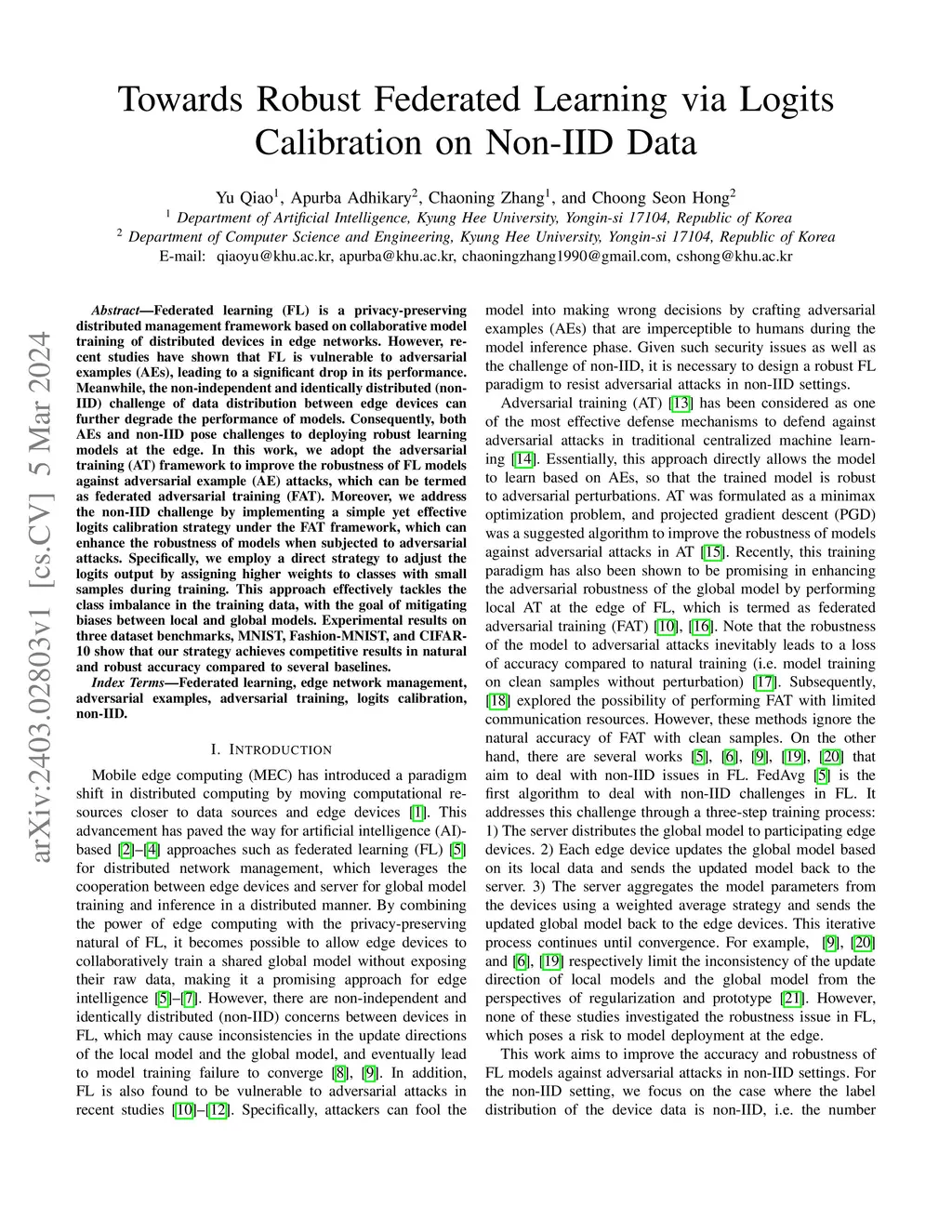 Federated learning (FL) is a privacy-preserving distributed management framework based on collaborative model training of distributed devices in edge networks. However, recent studies have shown that FL is vulnerable to adversarial examples (AEs), leading to a significant drop in its performance. Meanwhile, the non-independent and identically distributed (non-IID) challenge of data distribution between edge devices can further degrade the performance of models. Consequently, both AEs and non-IID pose challenges to deploying robust learning models at the edge. In this work, we adopt the adversarial training (AT) framework to improve the robustness of FL models against adversarial example (AE) attacks, which can be termed as federated adversarial training (FAT). Moreover, we address the non-IID challenge by implementing a simple yet effective logits calibration strategy under the FAT framework, which can enhance the robustness of models when subjected to adversarial attacks. Specifically, we employ a direct strategy to adjust the logits output by assigning higher weights to classes with small samples during training. This approach effectively tackles the class imbalance in the training data, with the goal of mitigating biases between local and global models. Experimental results on three dataset benchmarks, MNIST, Fashion-MNIST, and CIFAR-10 show that our strategy achieves competitive results in natural and robust accuracy compared to several baselines.