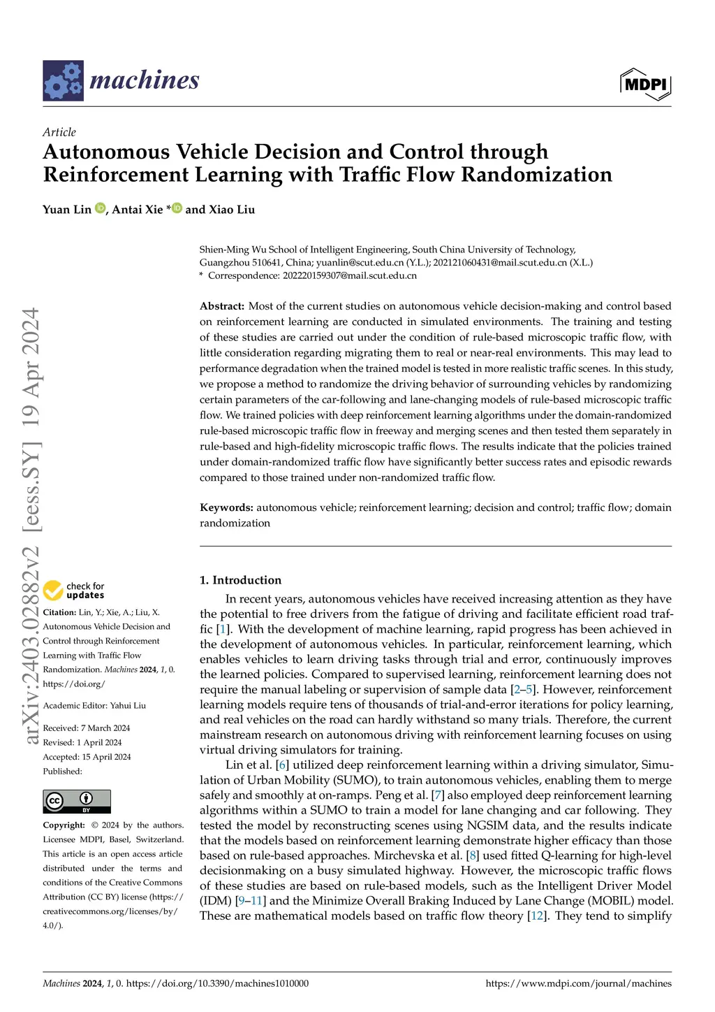 Most of the current studies on autonomous vehicle decision-making and control tasks based on reinforcement learning are conducted in simulated environments. The training and testing of these studies are carried out under rule-based microscopic traffic flow, with little consideration of migrating them to real or near-real environments to test their performance. It may lead to a degradation in performance when the trained model is tested in more realistic traffic scenes. In this study, we propose a method to randomize the driving style and behavior of surrounding vehicles by randomizing certain parameters of the car-following model and the lane-changing model of rule-based microscopic traffic flow in SUMO. We trained policies with deep reinforcement learning algorithms under the domain randomized rule-based microscopic traffic flow in freeway and merging scenes, and then tested them separately in rule-based microscopic traffic flow and high-fidelity microscopic traffic flow. Results indicate that the policy trained under domain randomization traffic flow has significantly better success rate and calculative reward compared to the models trained under other microscopic traffic flows.