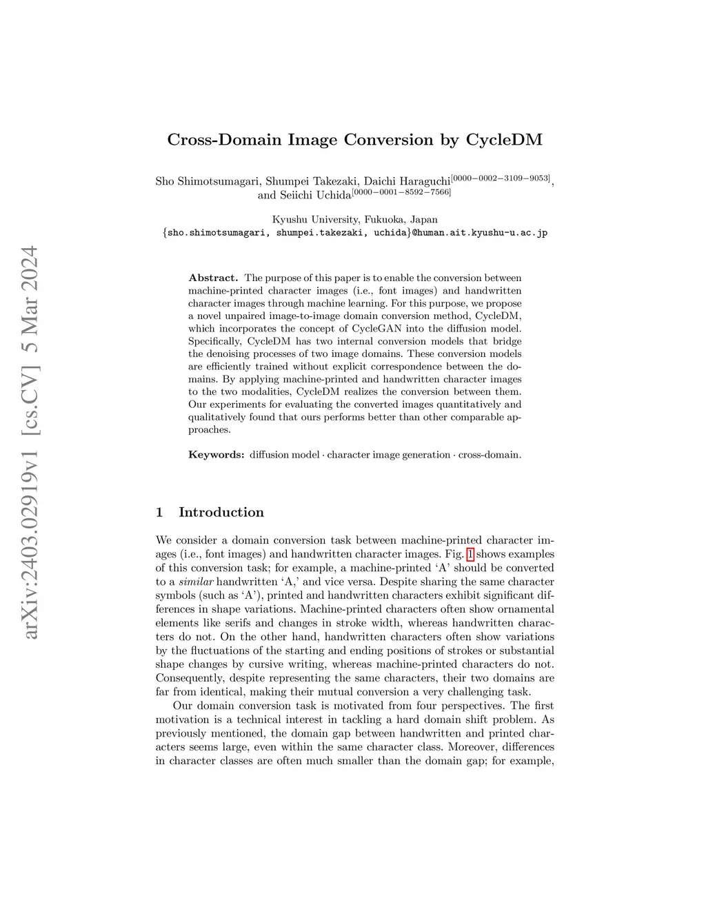 The purpose of this paper is to enable the conversion between machine-printed character images (i.e., font images) and handwritten character images through machine learning. For this purpose, we propose a novel unpaired image-to-image domain conversion method, CycleDM, which incorporates the concept of CycleGAN into the diffusion model. Specifically, CycleDM has two internal conversion models that bridge the denoising processes of two image domains. These conversion models are efficiently trained without explicit correspondence between the domains. By applying machine-printed and handwritten character images to the two modalities, CycleDM realizes the conversion between them. Our experiments for evaluating the converted images quantitatively and qualitatively found that ours performs better than other comparable approaches.