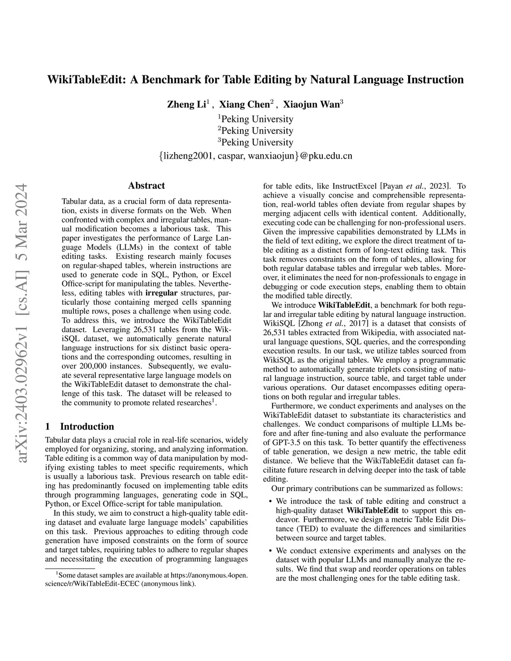 Tabular data, as a crucial form of data representation, exists in diverse formats on the Web. When confronted with complex and irregular tables, manual modification becomes a laborious task. This paper investigates the performance of Large Language Models (LLMs) in the context of table editing tasks. Existing research mainly focuses on regular-shaped tables, wherein instructions are used to generate code in SQL, Python, or Excel Office-script for manipulating the tables. Nevertheless, editing tables with irregular structures, particularly those containing merged cells spanning multiple rows, poses a challenge when using code. To address this, we introduce the WikiTableEdit dataset. Leveraging 26,531 tables from the WikiSQL dataset, we automatically generate natural language instructions for six distinct basic operations and the corresponding outcomes, resulting in over 200,000 instances. Subsequently, we evaluate several representative large language models on the WikiTableEdit dataset to demonstrate the challenge of this task. The dataset will be released to the community to promote related researches.