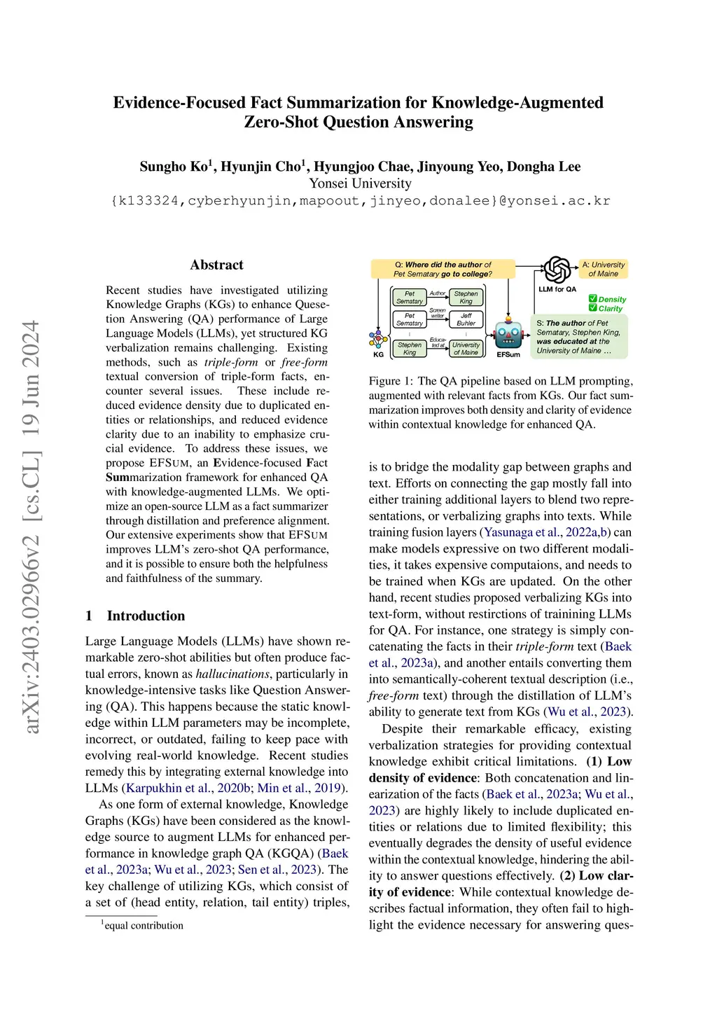 Recent studies have investigated utilizing Knowledge Graphs (KGs) to enhance Quesetion Answering (QA) performance of Large Language Models (LLMs), yet structured KG verbalization remains challengin. Existing methods, such as triple-form or free-form textual conversion of triple-form facts, encounter several issues. These include reduced evidence density due to duplicated entities or relationships, and reduced evidence clarity due to an inability to emphasize crucial evidence. To address these issues, we propose EFSum, an Evidence-focused Fact Summarization framework for enhanced QA with knowledge-augmented LLMs. We optimize an open-source LLM as a fact summarizer through distillation and preference alignment. Our extensive experiments show that EFSum improves LLM's zero-shot QA performance, and it is possible to ensure both the helpfulness and faithfulness of the summary.