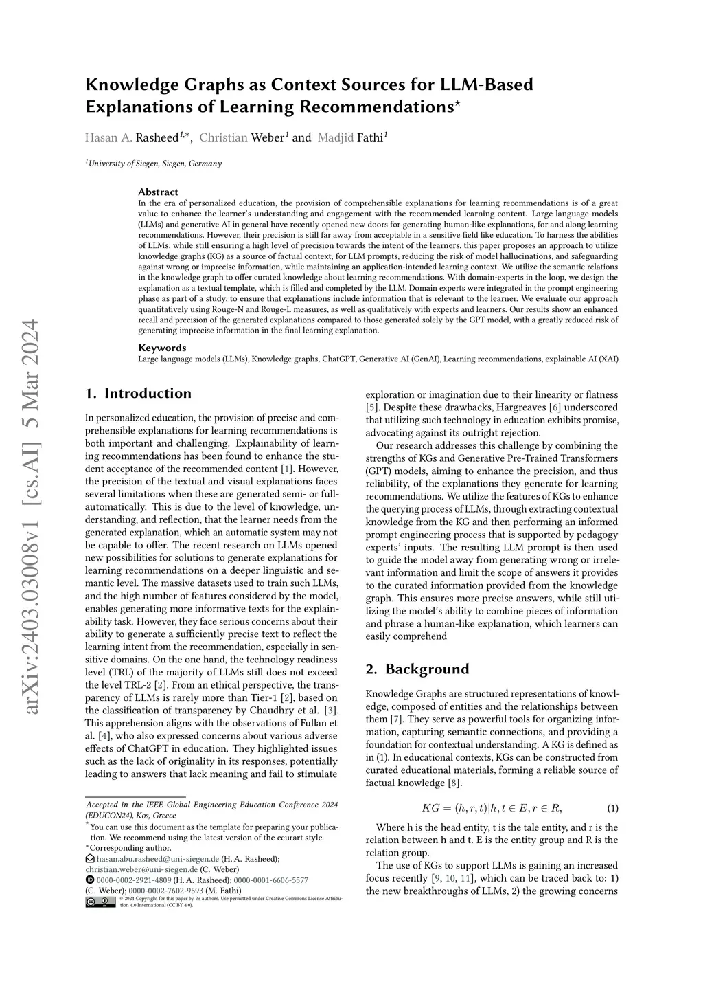 In the era of personalized education, the provision of comprehensible explanations for learning recommendations is of a great value to enhance the learner's understanding and engagement with the recommended learning content. Large language models (LLMs) and generative AI in general have recently opened new doors for generating human-like explanations, for and along learning recommendations. However, their precision is still far away from acceptable in a sensitive field like education. To harness the abilities of LLMs, while still ensuring a high level of precision towards the intent of the learners, this paper proposes an approach to utilize knowledge graphs (KG) as a source of factual context, for LLM prompts, reducing the risk of model hallucinations, and safeguarding against wrong or imprecise information, while maintaining an application-intended learning context. We utilize the semantic relations in the knowledge graph to offer curated knowledge about learning recommendations. With domain-experts in the loop, we design the explanation as a textual template, which is filled and completed by the LLM. Domain experts were integrated in the prompt engineering phase as part of a study, to ensure that explanations include information that is relevant to the learner. We evaluate our approach quantitatively using Rouge-N and Rouge-L measures, as well as qualitatively with experts and learners. Our results show an enhanced recall and precision of the generated explanations compared to those generated solely by the GPT model, with a greatly reduced risk of generating imprecise information in the final learning explanation.