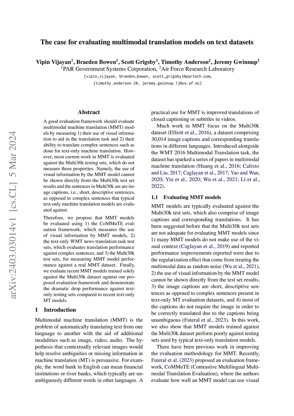 A good evaluation framework should evaluate multimodal machine translation (MMT) models by measuring 1) their use of visual information to aid in the translation task and 2) their ability to translate complex sentences such as done for text-only machine translation. However, most current work in MMT is evaluated against the Multi30k testing sets, which do not measure these properties. Namely, the use of visual information by the MMT model cannot be shown directly from the Multi30k test set results and the sentences in Multi30k are are image captions, i.e., short, descriptive sentences, as opposed to complex sentences that typical text-only machine translation models are evaluated against. Therefore, we propose that MMT models be evaluated using 1) the CoMMuTE evaluation framework, which measures the use of visual information by MMT models, 2) the text-only WMT news translation task test sets, which evaluates translation performance against complex sentences, and 3) the Multi30k test sets, for measuring MMT model performance against a real MMT dataset. Finally, we evaluate recent MMT models trained solely against the Multi30k dataset against our proposed evaluation framework and demonstrate the dramatic drop performance against text-only testing sets compared to recent text-only MT models.