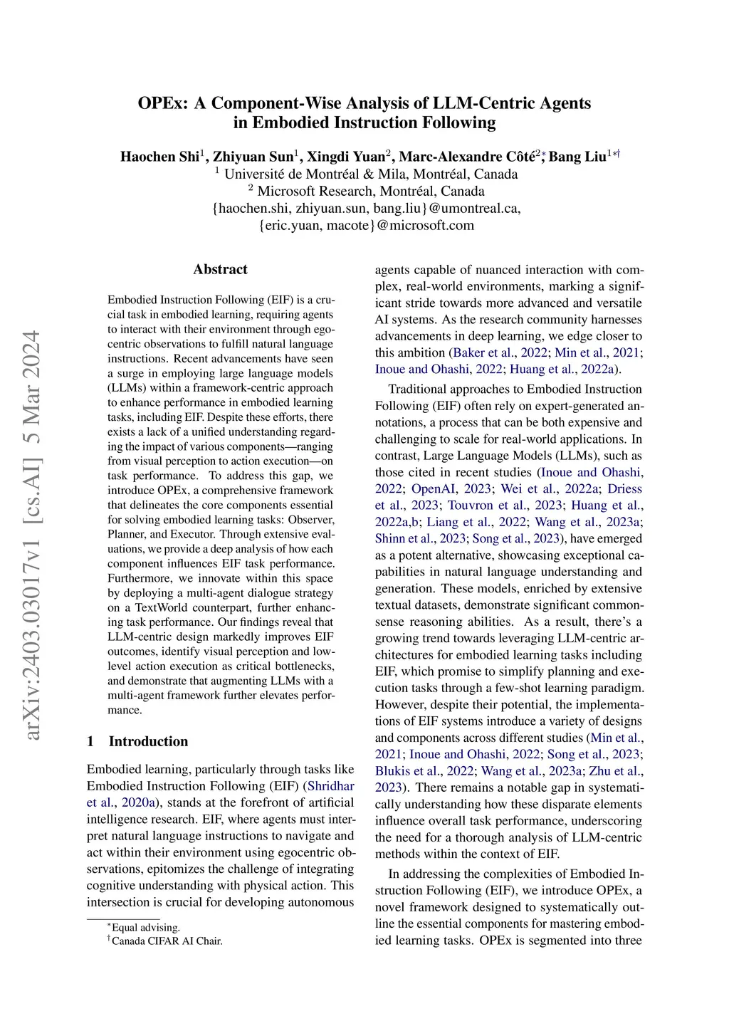 Embodied Instruction Following (EIF) is a crucial task in embodied learning, requiring agents to interact with their environment through egocentric observations to fulfill natural language instructions. Recent advancements have seen a surge in employing large language models (LLMs) within a framework-centric approach to enhance performance in embodied learning tasks, including EIF. Despite these efforts, there exists a lack of a unified understanding regarding the impact of various components-ranging from visual perception to action execution-on task performance. To address this gap, we introduce OPEx, a comprehensive framework that delineates the core components essential for solving embodied learning tasks: Observer, Planner, and Executor. Through extensive evaluations, we provide a deep analysis of how each component influences EIF task performance. Furthermore, we innovate within this space by deploying a multi-agent dialogue strategy on a TextWorld counterpart, further enhancing task performance. Our findings reveal that LLM-centric design markedly improves EIF outcomes, identify visual perception and low-level action execution as critical bottlenecks, and demonstrate that augmenting LLMs with a multi-agent framework further elevates performance.