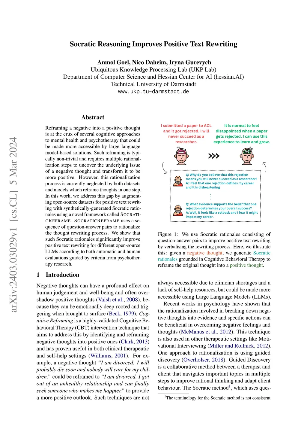 Reframing a negative into a positive thought is at the crux of several cognitive approaches to mental health and psychotherapy that could be made more accessible by large language model-based solutions. Such reframing is typically non-trivial and requires multiple rationalization steps to uncover the underlying issue of a negative thought and transform it to be more positive. However, this rationalization process is currently neglected by both datasets and models which reframe thoughts in one step. In this work, we address this gap by augmenting open-source datasets for positive text rewriting with synthetically-generated Socratic rationales using a novel framework called \textsc{SocraticReframe}. SocraticReframe uses a sequence of question-answer pairs to rationalize the thought rewriting process. We show that such Socratic rationales significantly improve positive text rewriting for different open-source LLMs according to both automatic and human evaluations guided by criteria from psychotherapy research. We validate our framework and the synthetic rationalizations with expert judgements from domain experts and psychology students in an IRB-approved annotation study. Our findings highlight the potential of utilizing the synergy between LLM reasoning and established psychotherapy techniques to build assistive solutions for reframing negative thoughts.
