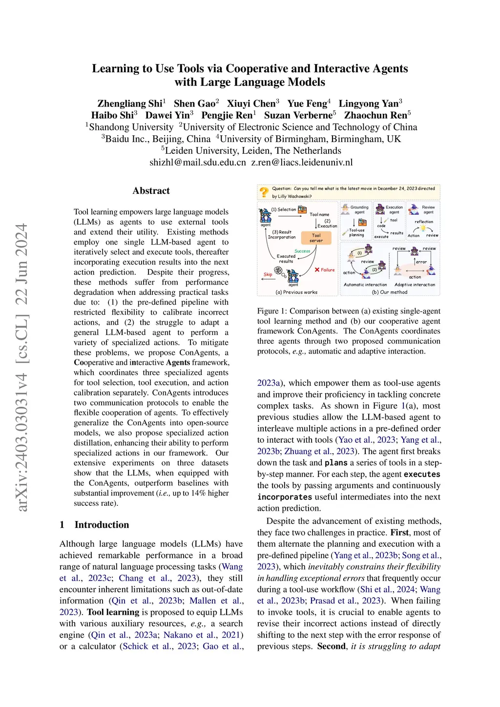 Tool learning empowers large language models (LLMs) as agents to use external tools and extend their utility. Existing methods employ one single LLM-based agent to iteratively select and execute tools, thereafter incorporating execution results into the next action prediction. Despite their progress, these methods suffer from performance degradation when addressing practical tasks due to: (1) the pre-defined pipeline with restricted flexibility to calibrate incorrect actions, and (2) the struggle to adapt a general LLM-based agent to perform a variety of specialized actions. To mitigate these problems, we propose ConAgents, a Cooperative and interactive Agents framework, which coordinates three specialized agents for tool selection, tool execution, and action calibration separately. ConAgents introduces two communication protocols to enable the flexible cooperation of agents. To effectively generalize the ConAgents into open-source models, we also propose specialized action distillation, enhancing their ability to perform specialized actions in our framework. Our extensive experiments on three datasets show that the LLMs, when equipped with the ConAgents, outperform baselines with substantial improvement (i.e., up to 14% higher success rate).