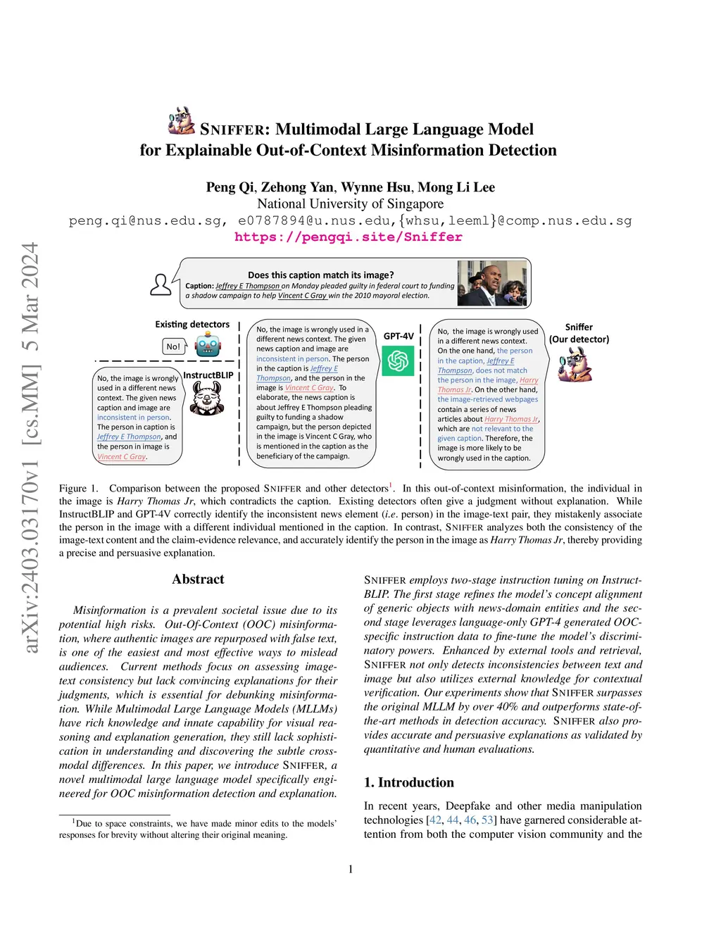 Misinformation is a prevalent societal issue due to its potential high risks. Out-of-context (OOC) misinformation, where authentic images are repurposed with false text, is one of the easiest and most effective ways to mislead audiences. Current methods focus on assessing image-text consistency but lack convincing explanations for their judgments, which is essential for debunking misinformation. While Multimodal Large Language Models (MLLMs) have rich knowledge and innate capability for visual reasoning and explanation generation, they still lack sophistication in understanding and discovering the subtle crossmodal differences. In this paper, we introduce SNIFFER, a novel multimodal large language model specifically engineered for OOC misinformation detection and explanation. SNIFFER employs two-stage instruction tuning on InstructBLIP. The first stage refines the model's concept alignment of generic objects with news-domain entities and the second stage leverages language-only GPT-4 generated OOC-specific instruction data to fine-tune the model's discriminatory powers. Enhanced by external tools and retrieval, SNIFFER not only detects inconsistencies between text and image but also utilizes external knowledge for contextual verification. Our experiments show that SNIFFER surpasses the original MLLM by over 40% and outperforms state-of-the-art methods in detection accuracy. SNIFFER also provides accurate and persuasive explanations as validated by quantitative and human evaluations.