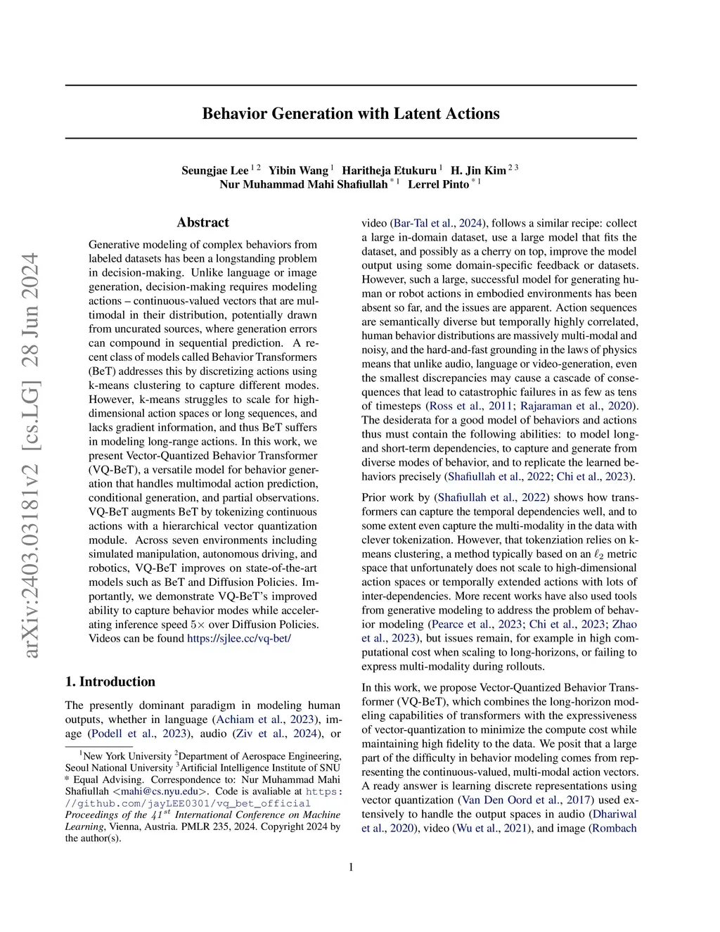 Generative modeling of complex behaviors from labeled datasets has been a longstanding problem in decision making. Unlike language or image generation, decision making requires modeling actions - continuous-valued vectors that are multimodal in their distribution, potentially drawn from uncurated sources, where generation errors can compound in sequential prediction. A recent class of models called Behavior Transformers (BeT) addresses this by discretizing actions using k-means clustering to capture different modes. However, k-means struggles to scale for high-dimensional action spaces or long sequences, and lacks gradient information, and thus BeT suffers in modeling long-range actions. In this work, we present Vector-Quantized Behavior Transformer (VQ-BeT), a versatile model for behavior generation that handles multimodal action prediction, conditional generation, and partial observations. VQ-BeT augments BeT by tokenizing continuous actions with a hierarchical vector quantization module. Across seven environments including simulated manipulation, autonomous driving, and robotics, VQ-BeT improves on state-of-the-art models such as BeT and Diffusion Policies. Importantly, we demonstrate VQ-BeT's improved ability to capture behavior modes while accelerating inference speed 5x over Diffusion Policies. Videos and code can be found https://sjlee.cc/vq-bet