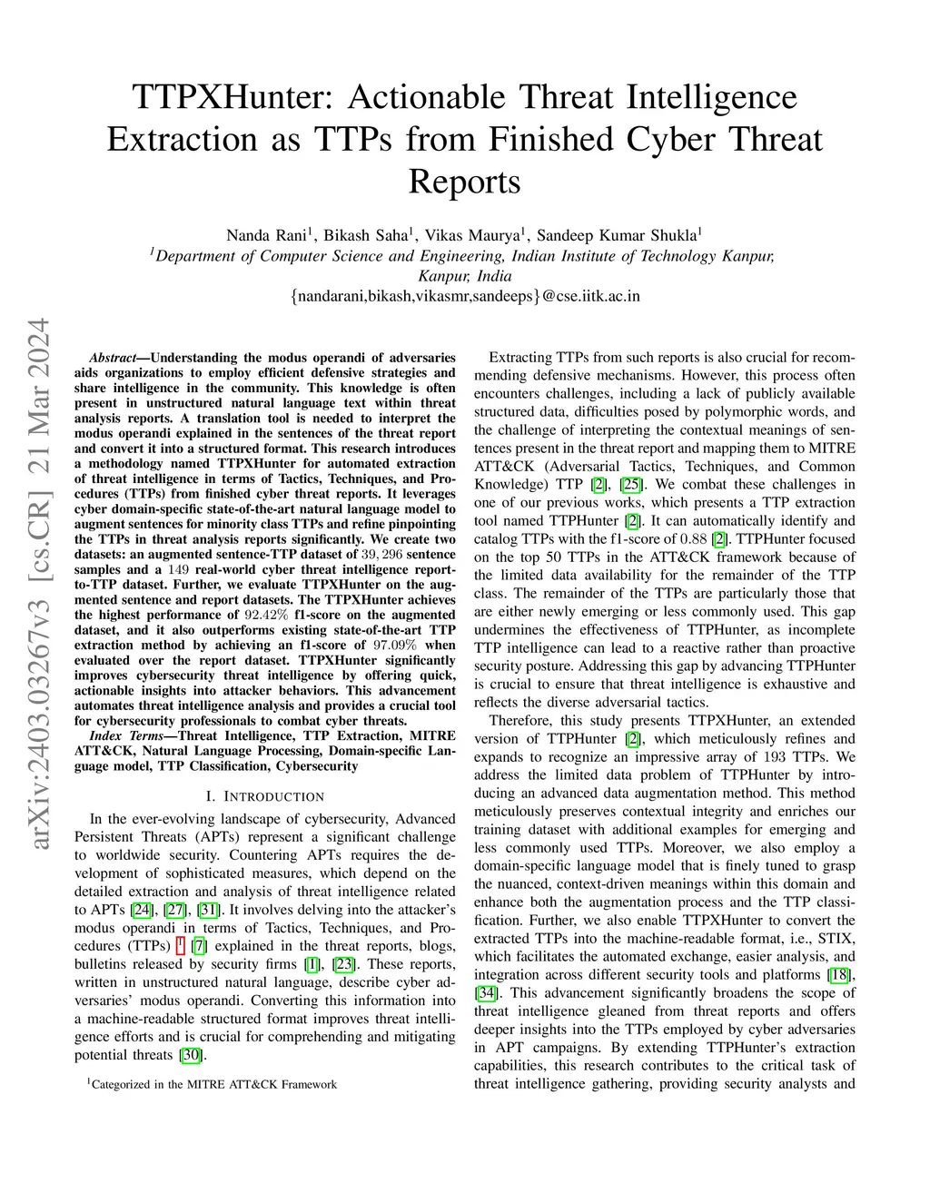 Understanding the modus operandi of adversaries aids organizations in employing efficient defensive strategies and sharing intelligence in the community. This knowledge is often present in unstructured natural language text within threat analysis reports. A translation tool is needed to interpret the modus operandi explained in the sentences of the threat report and translate it into a structured format. This research introduces a methodology named TTPXHunter for the automated extraction of threat intelligence in terms of Tactics, Techniques, and Procedures (TTPs) from finished cyber threat reports. It leverages cyber domain-specific state-of-the-art natural language processing (NLP) to augment sentences for minority class TTPs and refine pinpointing the TTPs in threat analysis reports significantly. The knowledge of threat intelligence in terms of TTPs is essential for comprehensively understanding cyber threats and enhancing detection and mitigation strategies. We create two datasets: an augmented sentence-TTP dataset of 39,296 samples and a 149 real-world cyber threat intelligence report-to-TTP dataset. Further, we evaluate TTPXHunter on the augmented sentence dataset and the cyber threat reports. The TTPXHunter achieves the highest performance of 92.42% f1-score on the augmented dataset, and it also outperforms existing state-of-the-art solutions in TTP extraction by achieving an f1-score of 97.09% when evaluated over the report dataset. TTPXHunter significantly improves cybersecurity threat intelligence by offering quick, actionable insights into attacker behaviors. This advancement automates threat intelligence analysis, providing a crucial tool for cybersecurity professionals fighting cyber threats.