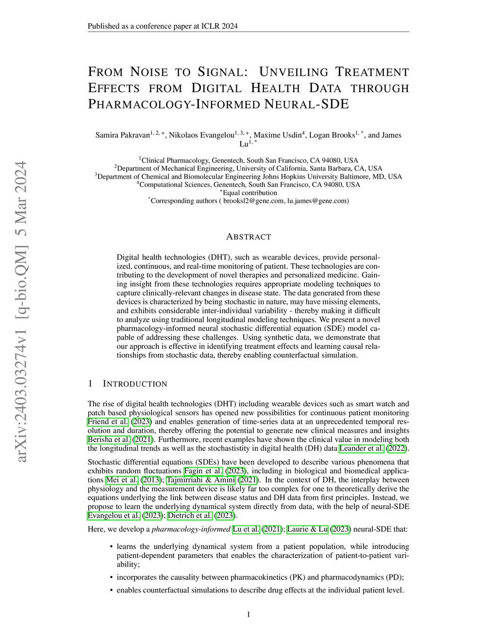 Digital health technologies (DHT), such as wearable devices, provide personalized, continuous, and real-time monitoring of patient. These technologies are contributing to the development of novel therapies and personalized medicine. Gaining insight from these technologies requires appropriate modeling techniques to capture clinically-relevant changes in disease state. The data generated from these devices is characterized by being stochastic in nature, may have missing elements, and exhibits considerable inter-individual variability - thereby making it difficult to analyze using traditional longitudinal modeling techniques. We present a novel pharmacology-informed neural stochastic differential equation (SDE) model capable of addressing these challenges. Using synthetic data, we demonstrate that our approach is effective in identifying treatment effects and learning causal relationships from stochastic data, thereby enabling counterfactual simulation.