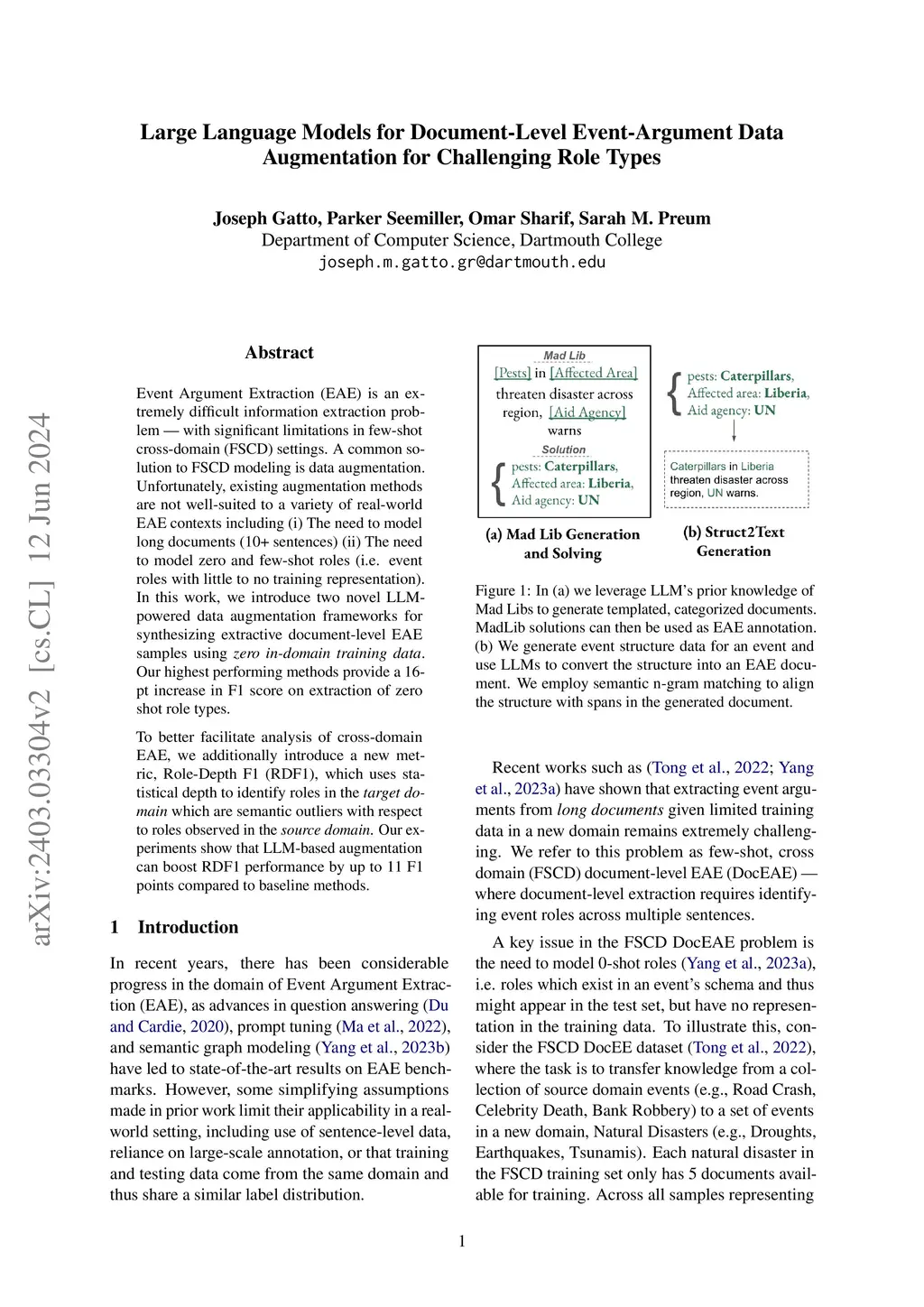 Event Argument Extraction (EAE) is an extremely difficult information extraction problem -- with significant limitations in few-shot cross-domain (FSCD) settings. A common solution to FSCD modeling is data augmentation. Unfortunately, existing augmentation methods are not well-suited to a variety of real-world EAE contexts including (i) The need to model long documents (10+ sentences) (ii) The need to model zero and few-shot roles (i.e. event roles with little to no training representation). In this work, we introduce two novel LLM-powered data augmentation frameworks for synthesizing extractive document-level EAE samples using zero in-domain training data. Our highest performing methods provide a 16-pt increase in F1 score on extraction of zero shot role types. To better facilitate analysis of cross-domain EAE, we additionally introduce a new metric, Role-Depth F1 (RDF1), which uses statistical depth to identify roles in the target domain which are semantic outliers with respect to roles observed in the source domain. Our experiments show that LLM-based augmentation can boost RDF1 performance by up to 11 F1 points compared to baseline methods.
