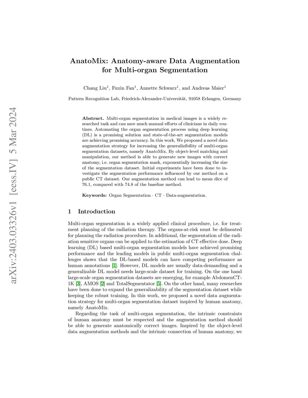 Multi-organ segmentation in medical images is a widely researched task and can save much manual efforts of clinicians in daily routines. Automating the organ segmentation process using deep learning (DL) is a promising solution and state-of-the-art segmentation models are achieving promising accuracy. In this work, We proposed a novel data augmentation strategy for increasing the generalizibility of multi-organ segmentation datasets, namely AnatoMix. By object-level matching and manipulation, our method is able to generate new images with correct anatomy, i.e. organ segmentation mask, exponentially increasing the size of the segmentation dataset. Initial experiments have been done to investigate the segmentation performance influenced by our method on a public CT dataset. Our augmentation method can lead to mean dice of 76.1, compared with 74.8 of the baseline method.