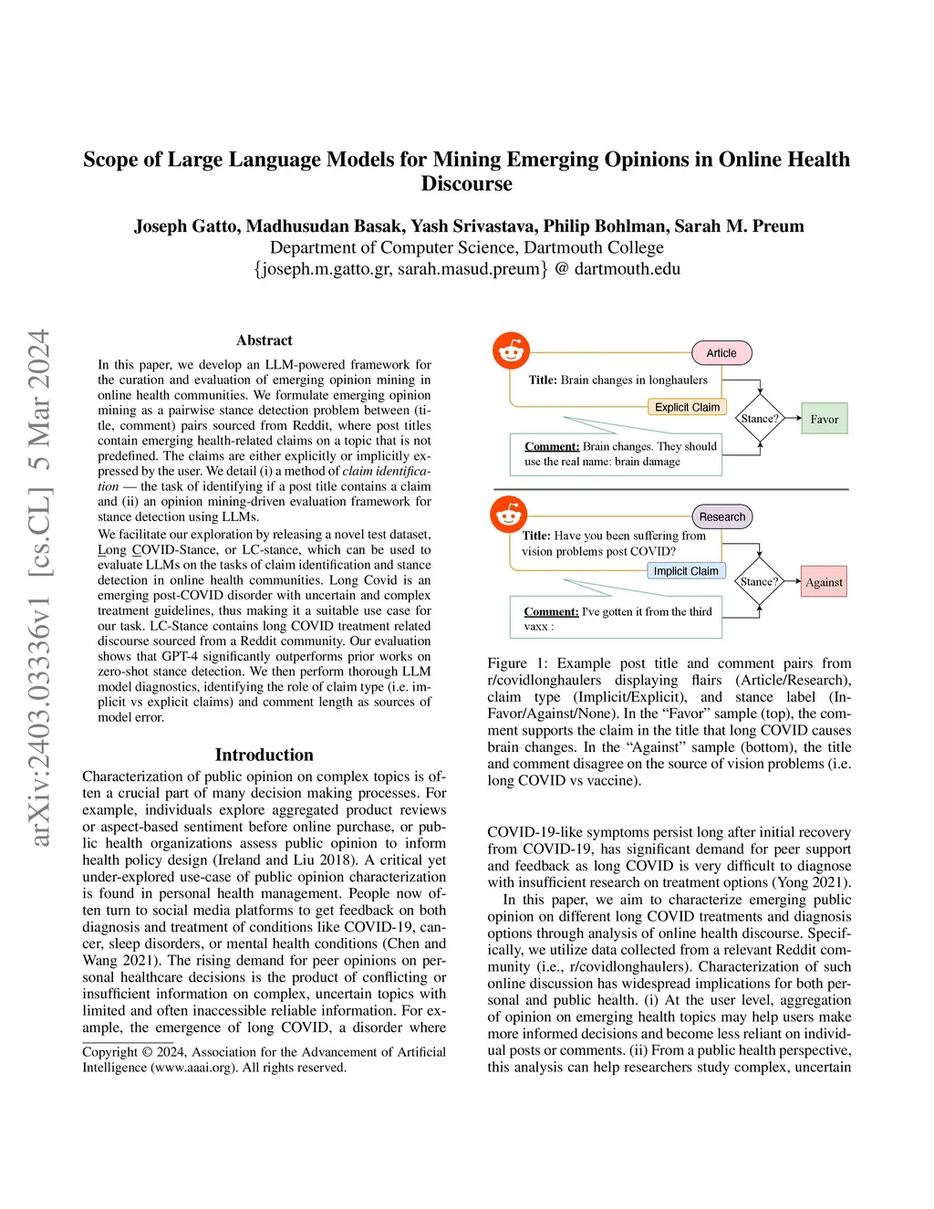 In this paper, we develop an LLM-powered framework for the curation and evaluation of emerging opinion mining in online health communities. We formulate emerging opinion mining as a pairwise stance detection problem between (title, comment) pairs sourced from Reddit, where post titles contain emerging health-related claims on a topic that is not predefined. The claims are either explicitly or implicitly expressed by the user. We detail (i) a method of claim identification -- the task of identifying if a post title contains a claim and (ii) an opinion mining-driven evaluation framework for stance detection using LLMs. We facilitate our exploration by releasing a novel test dataset, Long COVID-Stance, or LC-stance, which can be used to evaluate LLMs on the tasks of claim identification and stance detection in online health communities. Long Covid is an emerging post-COVID disorder with uncertain and complex treatment guidelines, thus making it a suitable use case for our task. LC-Stance contains long COVID treatment related discourse sourced from a Reddit community. Our evaluation shows that GPT-4 significantly outperforms prior works on zero-shot stance detection. We then perform thorough LLM model diagnostics, identifying the role of claim type (i.e. implicit vs explicit claims) and comment length as sources of model error.
