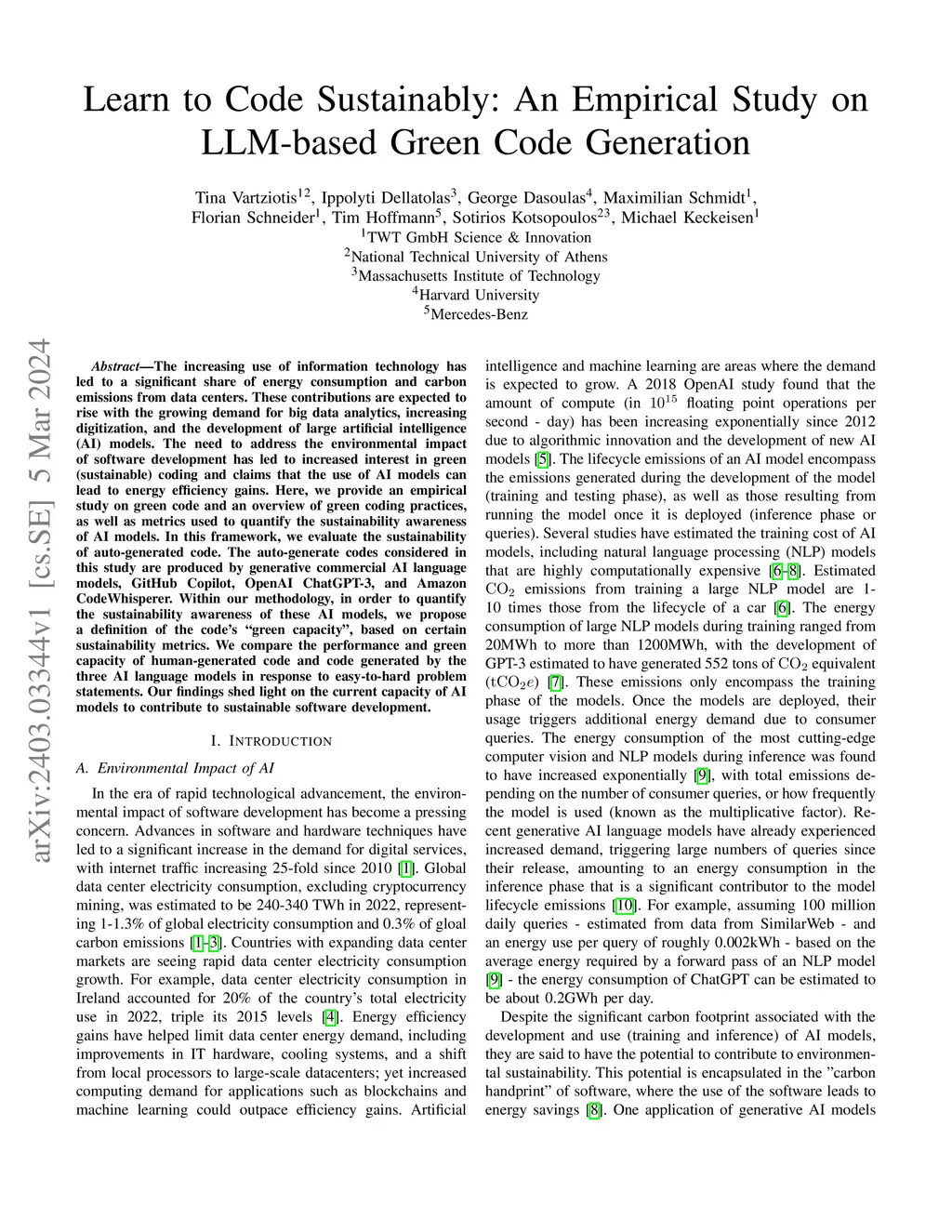 The increasing use of information technology has led to a significant share of energy consumption and carbon emissions from data centers. These contributions are expected to rise with the growing demand for big data analytics, increasing digitization, and the development of large artificial intelligence (AI) models. The need to address the environmental impact of software development has led to increased interest in green (sustainable) coding and claims that the use of AI models can lead to energy efficiency gains. Here, we provide an empirical study on green code and an overview of green coding practices, as well as metrics used to quantify the sustainability awareness of AI models. In this framework, we evaluate the sustainability of auto-generated code. The auto-generate codes considered in this study are produced by generative commercial AI language models, GitHub Copilot, OpenAI ChatGPT-3, and Amazon CodeWhisperer. Within our methodology, in order to quantify the sustainability awareness of these AI models, we propose a definition of the code's "green capacity", based on certain sustainability metrics. We compare the performance and green capacity of human-generated code and code generated by the three AI language models in response to easy-to-hard problem statements. Our findings shed light on the current capacity of AI models to contribute to sustainable software development.