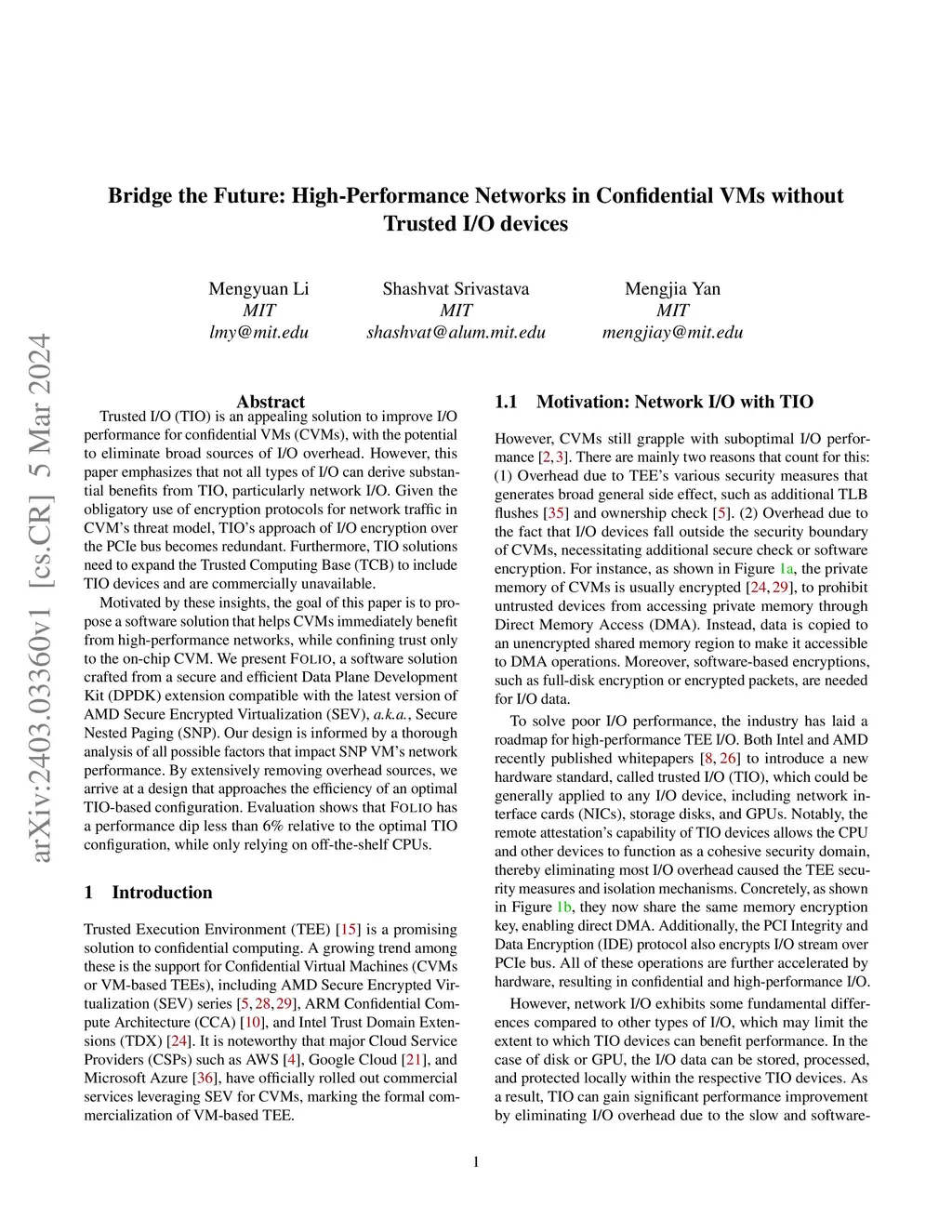 Trusted I/O (TIO) is an appealing solution to improve I/O performance for confidential VMs (CVMs), with the potential to eliminate broad sources of I/O overhead. However, this paper emphasizes that not all types of I/O can derive substantial benefits from TIO, particularly network I/O. Given the obligatory use of encryption protocols for network traffic in CVM's threat model, TIO's approach of I/O encryption over the PCIe bus becomes redundant. Furthermore, TIO solutions need to expand the Trusted Computing Base (TCB) to include TIO devices and are commercially unavailable. Motivated by these insights, the goal of this paper is to propose a software solution that helps CVMs immediately benefit from high-performance networks, while confining trust only to the on-chip CVM. We present FOLIO, a software solution crafted from a secure and efficient Data Plane Development Kit (DPDK) extension compatible with the latest version of AMD Secure Encrypted Virtualization (SEV), a.k.a., Secure Nested Paging (SNP). Our design is informed by a thorough analysis of all possible factors that impact SNP VM's network performance. By extensively removing overhead sources, we arrive at a design that approaches the efficiency of an optimal TIO-based configuration. Evaluation shows that FOLIO has a performance dip less than 6% relative to the optimal TIO configuration, while only relying on off-the-shelf CPUs.