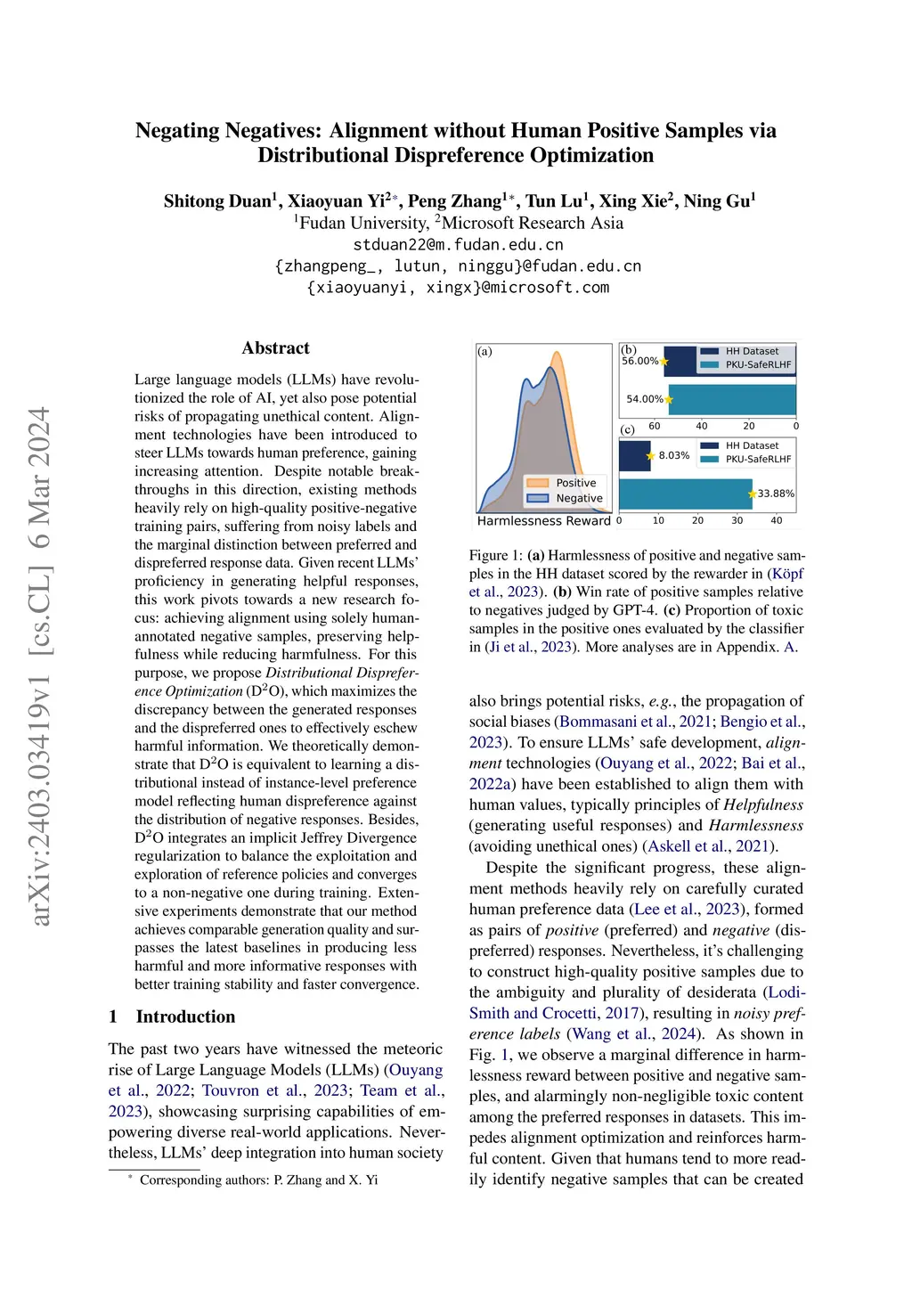Large language models (LLMs) have revolutionized the role of AI, yet also pose potential risks of propagating unethical content. Alignment technologies have been introduced to steer LLMs towards human preference, gaining increasing attention. Despite notable breakthroughs in this direction, existing methods heavily rely on high-quality positive-negative training pairs, suffering from noisy labels and the marginal distinction between preferred and dispreferred response data. Given recent LLMs' proficiency in generating helpful responses, this work pivots towards a new research focus: achieving alignment using solely human-annotated negative samples, preserving helpfulness while reducing harmfulness. For this purpose, we propose Distributional Dispreference Optimization (DO), which maximizes the discrepancy between the generated responses and the dispreferred ones to effectively eschew harmful information. We theoretically demonstrate that DO is equivalent to learning a distributional instead of instance-level preference model reflecting human dispreference against the distribution of negative responses. Besides, DO integrates an implicit Jeffrey Divergence regularization to balance the exploitation and exploration of reference policies and converges to a non-negative one during training. Extensive experiments demonstrate that our method achieves comparable generation quality and surpasses the latest baselines in producing less harmful and more informative responses with better training stability and faster convergence.