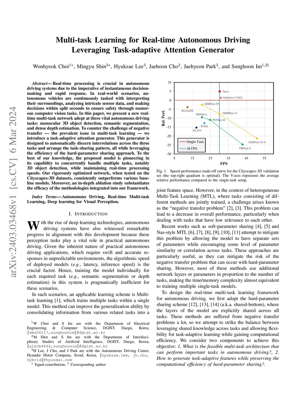 Real-time processing is crucial in autonomous driving systems due to the imperative of instantaneous decision-making and rapid response. In real-world scenarios, autonomous vehicles are continuously tasked with interpreting their surroundings, analyzing intricate sensor data, and making decisions within split seconds to ensure safety through numerous computer vision tasks. In this paper, we present a new real-time multi-task network adept at three vital autonomous driving tasks: monocular 3D object detection, semantic segmentation, and dense depth estimation. To counter the challenge of negative transfer, which is the prevalent issue in multi-task learning, we introduce a task-adaptive attention generator. This generator is designed to automatically discern interrelations across the three tasks and arrange the task-sharing pattern, all while leveraging the efficiency of the hard-parameter sharing approach. To the best of our knowledge, the proposed model is pioneering in its capability to concurrently handle multiple tasks, notably 3D object detection, while maintaining real-time processing speeds. Our rigorously optimized network, when tested on the Cityscapes-3D datasets, consistently outperforms various baseline models. Moreover, an in-depth ablation study substantiates the efficacy of the methodologies integrated into our framework.