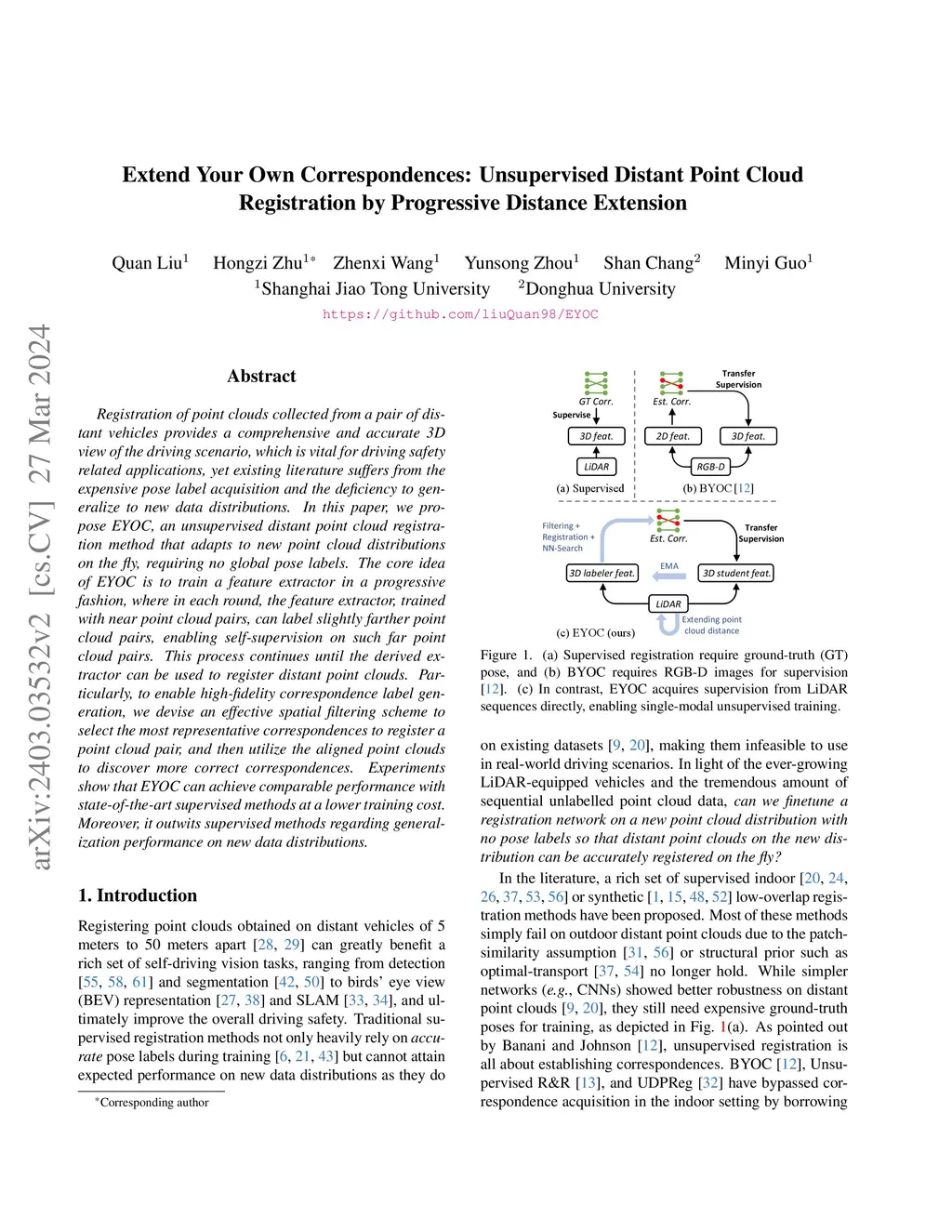 Registration of point clouds collected from a pair of distant vehicles provides a comprehensive and accurate 3D view of the driving scenario, which is vital for driving safety related applications, yet existing literature suffers from the expensive pose label acquisition and the deficiency to generalize to new data distributions. In this paper, we propose EYOC, an unsupervised distant point cloud registration method that adapts to new point cloud distributions on the fly, requiring no global pose labels. The core idea of EYOC is to train a feature extractor in a progressive fashion, where in each round, the feature extractor, trained with near point cloud pairs, can label slightly farther point cloud pairs, enabling self-supervision on such far point cloud pairs. This process continues until the derived extractor can be used to register distant point clouds. Particularly, to enable high-fidelity correspondence label generation, we devise an effective spatial filtering scheme to select the most representative correspondences to register a point cloud pair, and then utilize the aligned point clouds to discover more correct correspondences. Experiments show that EYOC can achieve comparable performance with state-of-the-art supervised methods at a lower training cost. Moreover, it outwits supervised methods regarding generalization performance on new data distributions.