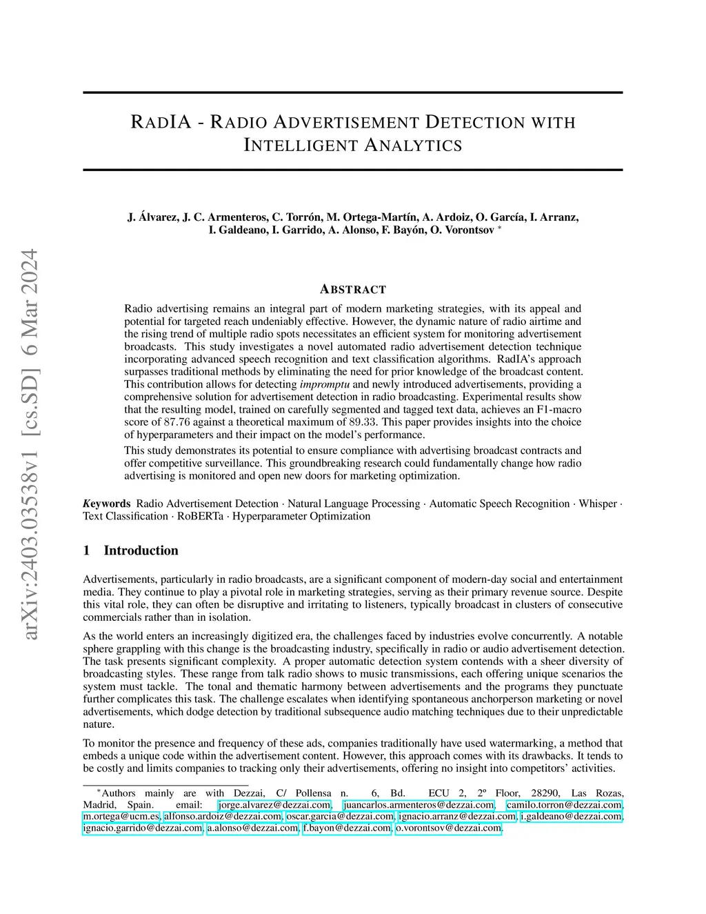 Radio advertising remains an integral part of modern marketing strategies, with its appeal and potential for targeted reach undeniably effective. However, the dynamic nature of radio airtime and the rising trend of multiple radio spots necessitates an efficient system for monitoring advertisement broadcasts. This study investigates a novel automated radio advertisement detection technique incorporating advanced speech recognition and text classification algorithms. RadIA's approach surpasses traditional methods by eliminating the need for prior knowledge of the broadcast content. This contribution allows for detecting impromptu and newly introduced advertisements, providing a comprehensive solution for advertisement detection in radio broadcasting. Experimental results show that the resulting model, trained on carefully segmented and tagged text data, achieves an F1-macro score of 87.76 against a theoretical maximum of 89.33. This paper provides insights into the choice of hyperparameters and their impact on the model's performance. This study demonstrates its potential to ensure compliance with advertising broadcast contracts and offer competitive surveillance. This groundbreaking research could fundamentally change how radio advertising is monitored and open new doors for marketing optimization.