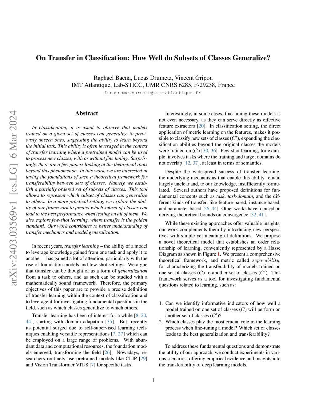 In classification, it is usual to observe that models trained on a given set of classes can generalize to previously unseen ones, suggesting the ability to learn beyond the initial task. This ability is often leveraged in the context of transfer learning where a pretrained model can be used to process new classes, with or without fine tuning. Surprisingly, there are a few papers looking at the theoretical roots beyond this phenomenon. In this work, we are interested in laying the foundations of such a theoretical framework for transferability between sets of classes. Namely, we establish a partially ordered set of subsets of classes. This tool allows to represent which subset of classes can generalize to others. In a more practical setting, we explore the ability of our framework to predict which subset of classes can lead to the best performance when testing on all of them. We also explore few-shot learning, where transfer is the golden standard. Our work contributes to better understanding of transfer mechanics and model generalization.