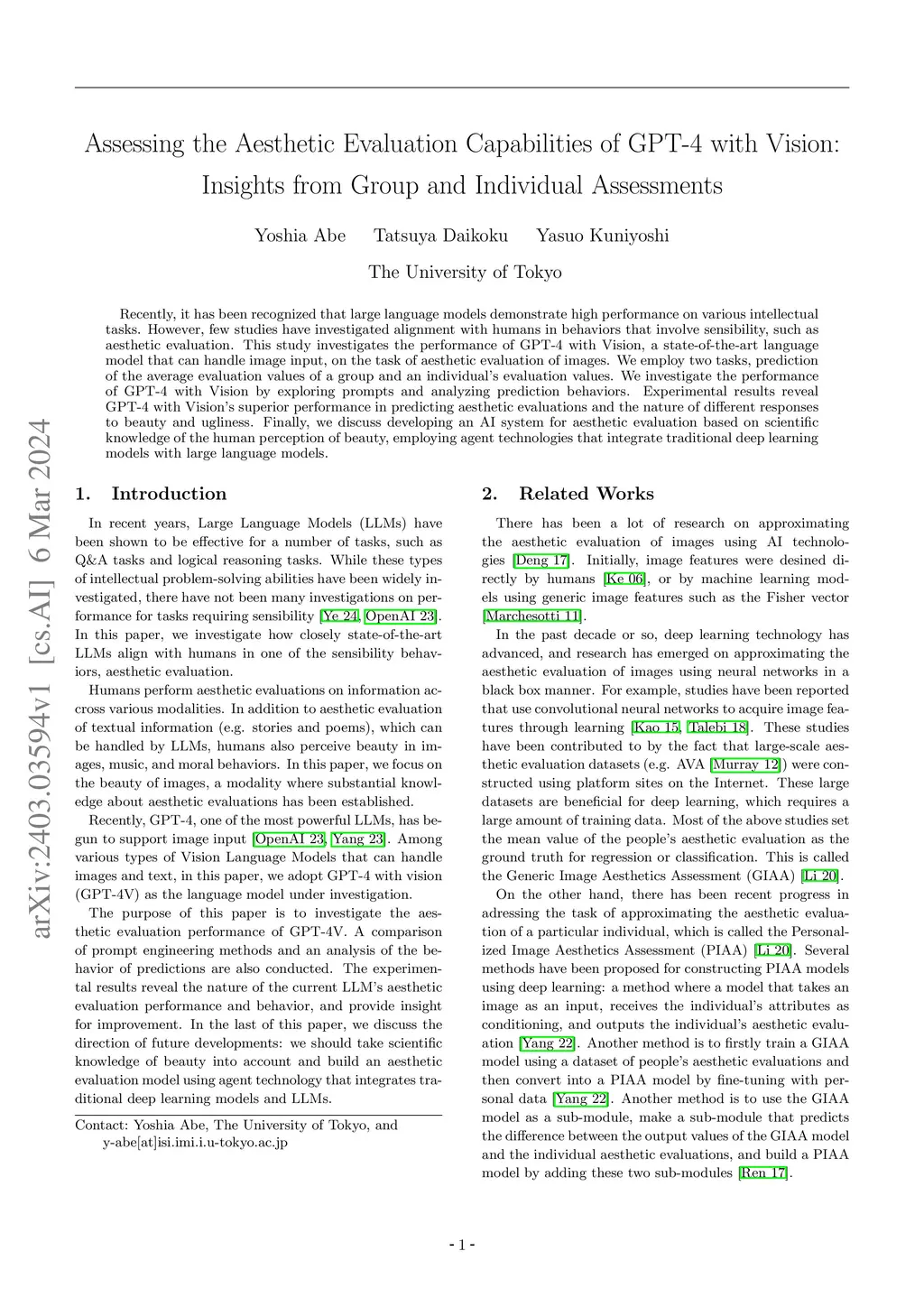 Recently, it has been recognized that large language models demonstrate high performance on various intellectual tasks. However, few studies have investigated alignment with humans in behaviors that involve sensibility, such as aesthetic evaluation. This study investigates the performance of GPT-4 with Vision, a state-of-the-art language model that can handle image input, on the task of aesthetic evaluation of images. We employ two tasks, prediction of the average evaluation values of a group and an individual's evaluation values. We investigate the performance of GPT-4 with Vision by exploring prompts and analyzing prediction behaviors. Experimental results reveal GPT-4 with Vision's superior performance in predicting aesthetic evaluations and the nature of different responses to beauty and ugliness. Finally, we discuss developing an AI system for aesthetic evaluation based on scientific knowledge of the human perception of beauty, employing agent technologies that integrate traditional deep learning models with large language models.