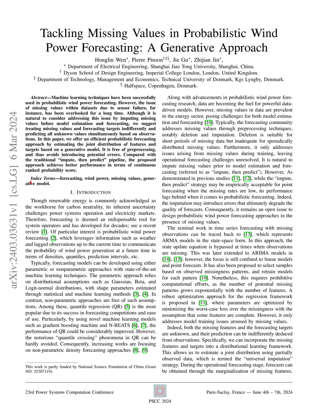 Machine learning methods are widely and successfully used for probabilistic wind power forecasting, yet the pervasive issue of missing values (e.g., due to sensor faults or communication outages) has received limited attention. The prevailing practice is impute-then-predict, but conditioning on point imputations biases parameter estimates and fails to propagate uncertainty from missing features. Our approach treats missing features and forecast targets uniformly: we learn a joint generative model of features and targets from incomplete data and, at operational deployment, condition on the observed features and marginalize the unobserved ones to produce forecasts. This imputation-free procedure avoids error introduced by imputation and preserves uncertainty aroused from missing features. In experiments, it improves forecast quality in terms of continuous ranked probability score relative to impute-then-predict baselines while incurring substantially lower computational cost than common alternatives.