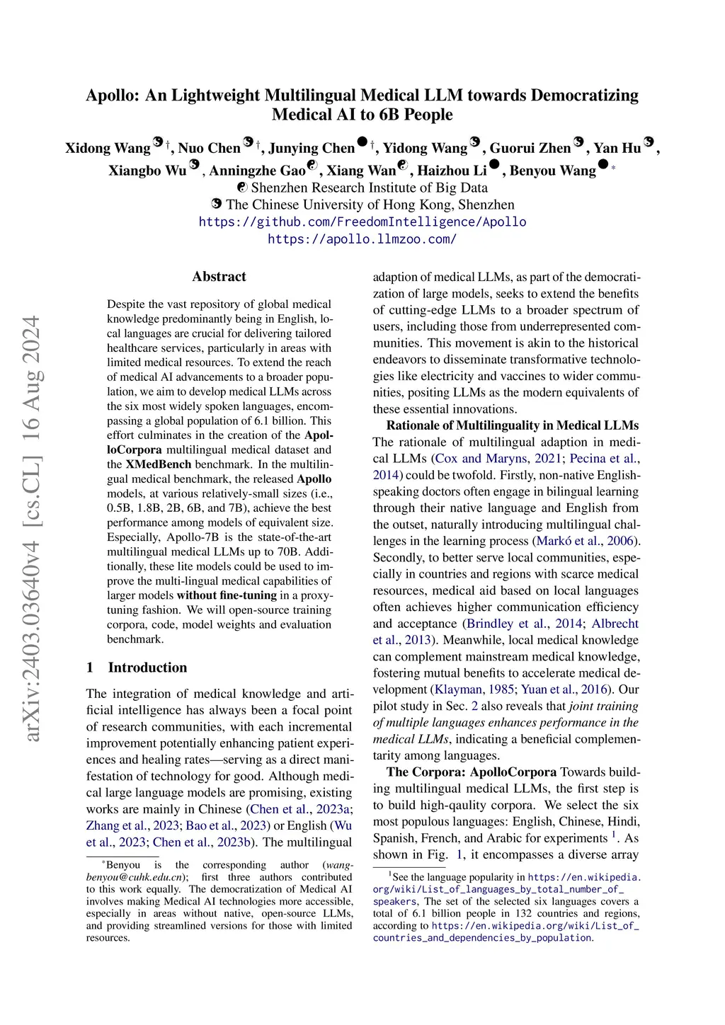 Despite the vast repository of global medical knowledge predominantly being in English, local languages are crucial for delivering tailored healthcare services, particularly in areas with limited medical resources. To extend the reach of medical AI advancements to a broader population, we aim to develop medical LLMs across the six most widely spoken languages, encompassing a global population of 6.1 billion. This effort culminates in the creation of the ApolloCorpora multilingual medical dataset and the XMedBench benchmark. In the multilingual medical benchmark, the released Apollo models, at various relatively-small sizes (i.e., 0.5B, 1.8B, 2B, 6B, and 7B), achieve the best performance among models of equivalent size. Especially, Apollo-7B is the state-of-the-art multilingual medical LLMs up to 70B. Additionally, these lite models could be used to improve the multi-lingual medical capabilities of larger models without fine-tuning in a proxy-tuning fashion. We will open-source training corpora, code, model weights and evaluation benchmark.
