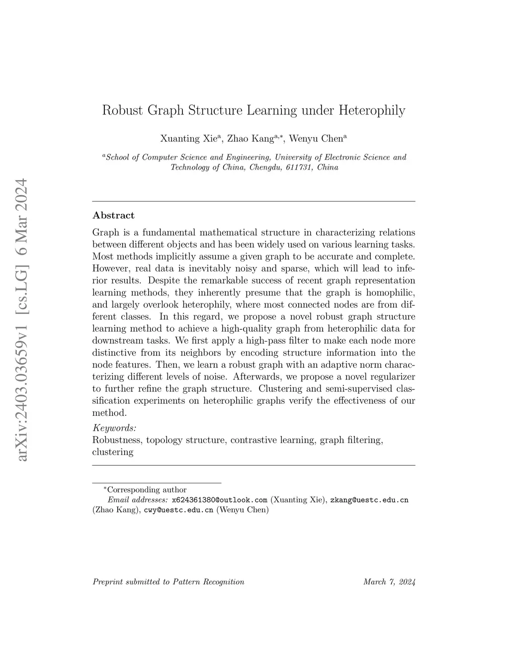 Graph is a fundamental mathematical structure in characterizing relations between different objects and has been widely used on various learning tasks. Most methods implicitly assume a given graph to be accurate and complete. However, real data is inevitably noisy and sparse, which will lead to inferior results. Despite the remarkable success of recent graph representation learning methods, they inherently presume that the graph is homophilic, and largely overlook heterophily, where most connected nodes are from different classes. In this regard, we propose a novel robust graph structure learning method to achieve a high-quality graph from heterophilic data for downstream tasks. We first apply a high-pass filter to make each node more distinctive from its neighbors by encoding structure information into the node features. Then, we learn a robust graph with an adaptive norm characterizing different levels of noise. Afterwards, we propose a novel regularizer to further refine the graph structure. Clustering and semi-supervised classification experiments on heterophilic graphs verify the effectiveness of our method.