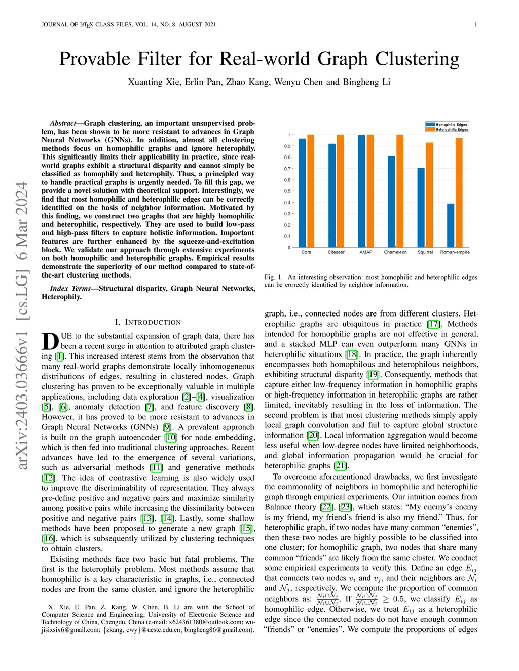 Graph clustering, an important unsupervised problem, has been shown to be more resistant to advances in Graph Neural Networks (GNNs). In addition, almost all clustering methods focus on homophilic graphs and ignore heterophily. This significantly limits their applicability in practice, since real-world graphs exhibit a structural disparity and cannot simply be classified as homophily and heterophily. Thus, a principled way to handle practical graphs is urgently needed. To fill this gap, we provide a novel solution with theoretical support. Interestingly, we find that most homophilic and heterophilic edges can be correctly identified on the basis of neighbor information. Motivated by this finding, we construct two graphs that are highly homophilic and heterophilic, respectively. They are used to build low-pass and high-pass filters to capture holistic information. Important features are further enhanced by the squeeze-and-excitation block. We validate our approach through extensive experiments on both homophilic and heterophilic graphs. Empirical results demonstrate the superiority of our method compared to state-of-the-art clustering methods.
