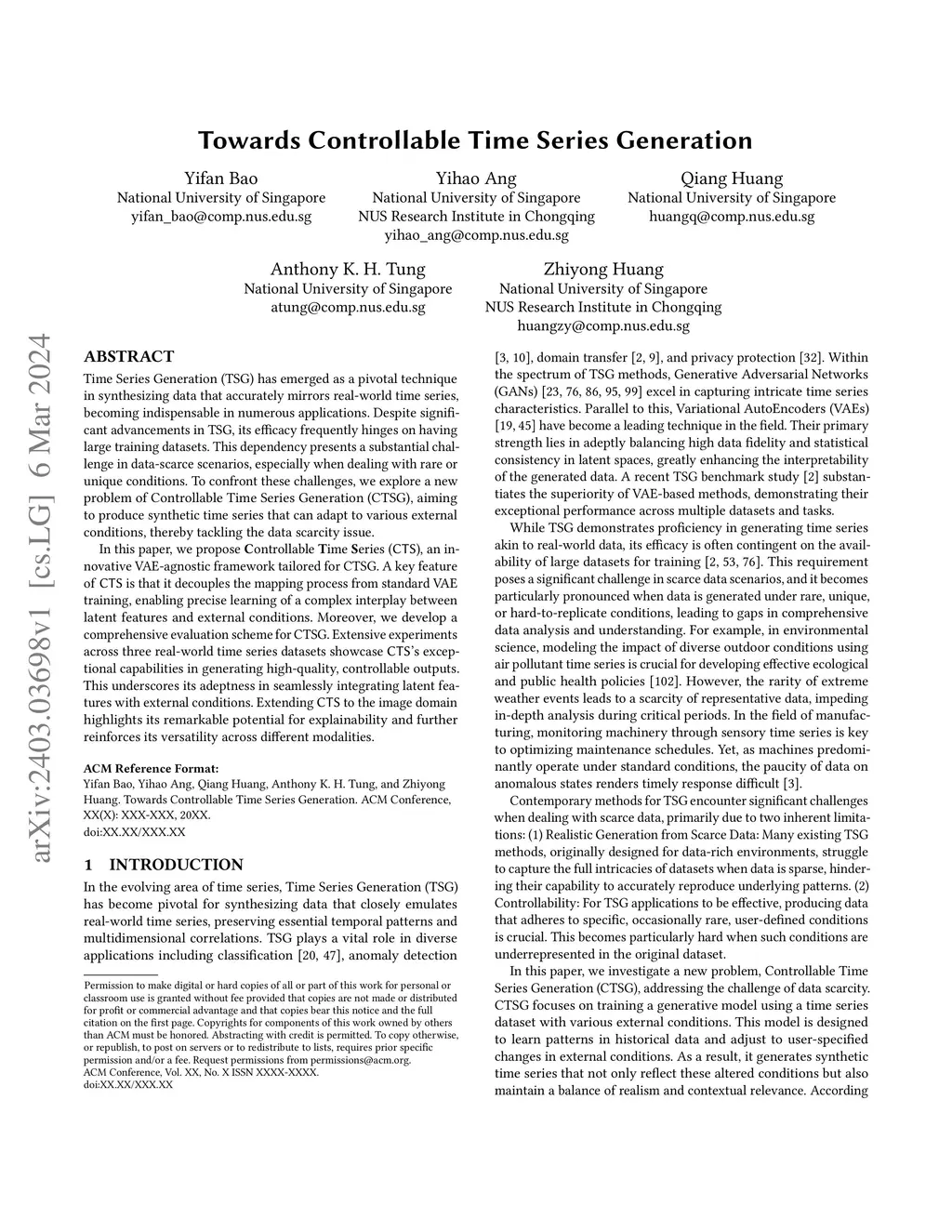 Time Series Generation (TSG) has emerged as a pivotal technique in synthesizing data that accurately mirrors real-world time series, becoming indispensable in numerous applications. Despite significant advancements in TSG, its efficacy frequently hinges on having large training datasets. This dependency presents a substantial challenge in data-scarce scenarios, especially when dealing with rare or unique conditions. To confront these challenges, we explore a new problem of Controllable Time Series Generation (CTSG), aiming to produce synthetic time series that can adapt to various external conditions, thereby tackling the data scarcity issue. In this paper, we propose \textbf{C}ontrollable \textbf{T}ime \textbf{S}eries (\textsf{CTS}), an innovative VAE-agnostic framework tailored for CTSG. A key feature of \textsf{CTS} is that it decouples the mapping process from standard VAE training, enabling precise learning of a complex interplay between latent features and external conditions. Moreover, we develop a comprehensive evaluation scheme for CTSG. Extensive experiments across three real-world time series datasets showcase \textsf{CTS}'s exceptional capabilities in generating high-quality, controllable outputs. This underscores its adeptness in seamlessly integrating latent features with external conditions. Extending \textsf{CTS} to the image domain highlights its remarkable potential for explainability and further reinforces its versatility across different modalities.