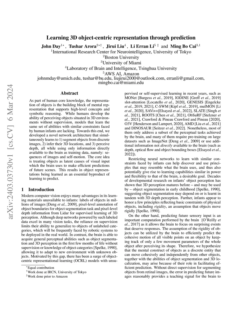As part of human core knowledge, the representation of objects is the building block of mental representation that supports high-level concepts and symbolic reasoning. While humans develop the ability of perceiving objects situated in 3D environments without supervision, models that learn the same set of abilities with similar constraints faced by human infants are lacking. Towards this end, we developed a novel network architecture that simultaneously learns to 1) segment objects from discrete images, 2) infer their 3D locations, and 3) perceive depth, all while using only information directly available to the brain as training data, namely: sequences of images and self-motion. The core idea is treating objects as latent causes of visual input which the brain uses to make efficient predictions of future scenes. This results in object representations being learned as an essential byproduct of learning to predict.