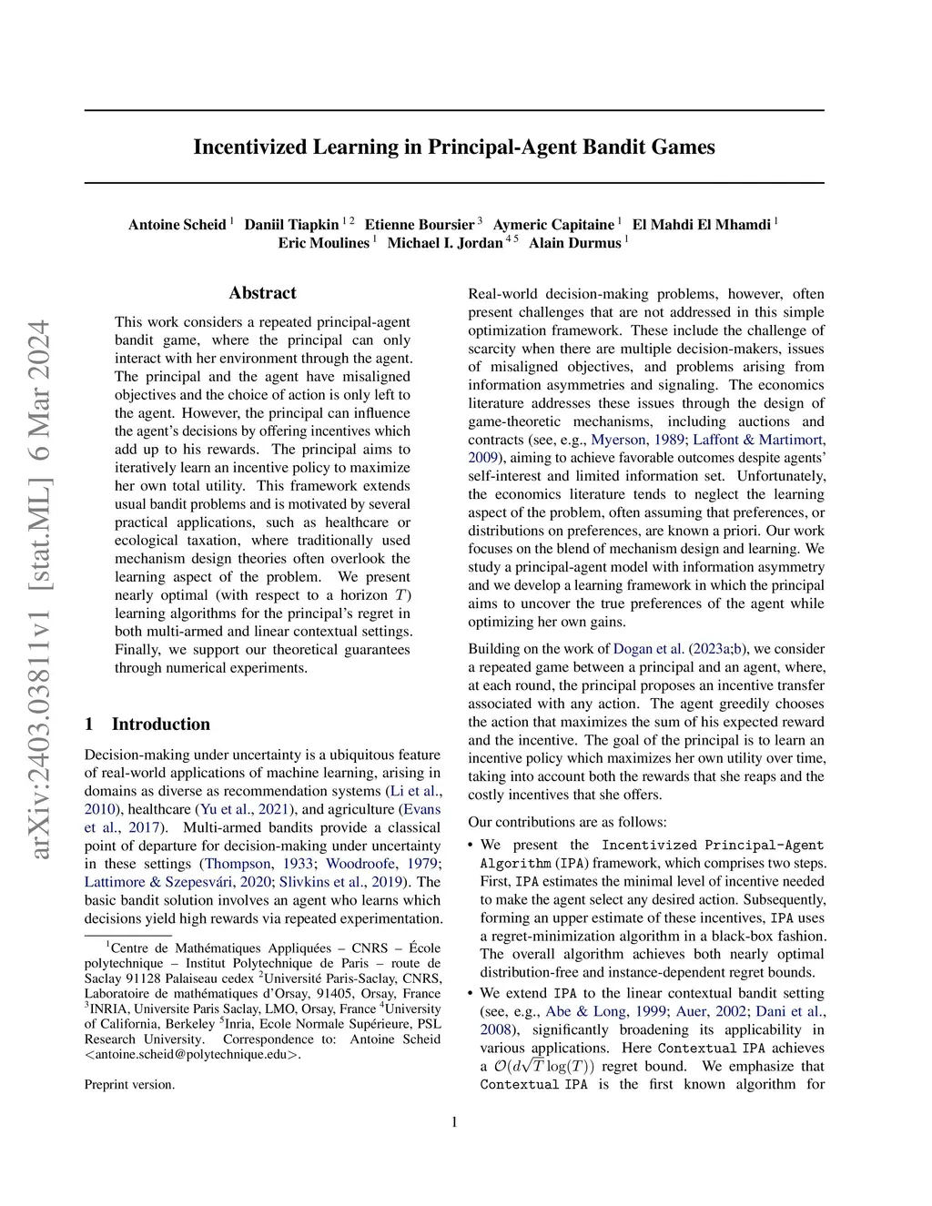 This work considers a repeated principal-agent bandit game, where the principal can only interact with her environment through the agent. The principal and the agent have misaligned objectives and the choice of action is only left to the agent. However, the principal can influence the agent's decisions by offering incentives which add up to his rewards. The principal aims to iteratively learn an incentive policy to maximize her own total utility. This framework extends usual bandit problems and is motivated by several practical applications, such as healthcare or ecological taxation, where traditionally used mechanism design theories often overlook the learning aspect of the problem. We present nearly optimal (with respect to a horizon ) learning algorithms for the principal's regret in both multi-armed and linear contextual settings. Finally, we support our theoretical guarantees through numerical experiments.