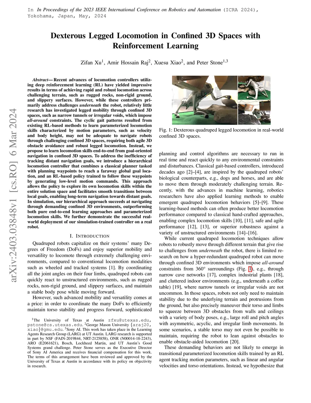 Dexterous Legged Locomotion in Confined 3D Spaces with Reinforcement