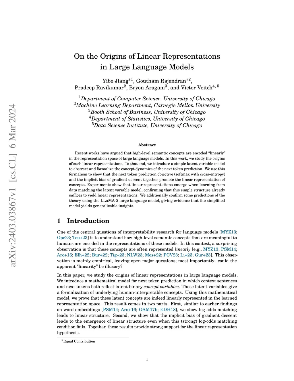 Recent works have argued that high-level semantic concepts are encoded "linearly" in the representation space of large language models. In this work, we study the origins of such linear representations. To that end, we introduce a simple latent variable model to abstract and formalize the concept dynamics of the next token prediction. We use this formalism to show that the next token prediction objective (softmax with cross-entropy) and the implicit bias of gradient descent together promote the linear representation of concepts. Experiments show that linear representations emerge when learning from data matching the latent variable model, confirming that this simple structure already suffices to yield linear representations. We additionally confirm some predictions of the theory using the LLaMA-2 large language model, giving evidence that the simplified model yields generalizable insights.