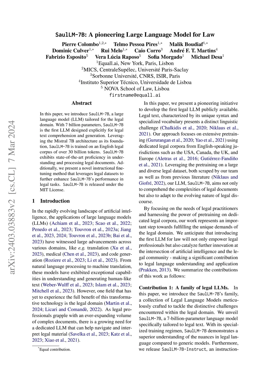 In this paper, we introduce SaulLM-7B, a large language model (LLM) tailored for the legal domain. With 7 billion parameters, SaulLM-7B is the first LLM designed explicitly for legal text comprehension and generation. Leveraging the Mistral 7B architecture as its foundation, SaulLM-7B is trained on an English legal corpus of over 30 billion tokens. SaulLM-7B exhibits state-of-the-art proficiency in understanding and processing legal documents. Additionally, we present a novel instructional fine-tuning method that leverages legal datasets to further enhance SaulLM-7B's performance in legal tasks. SaulLM-7B is released under the MIT License.