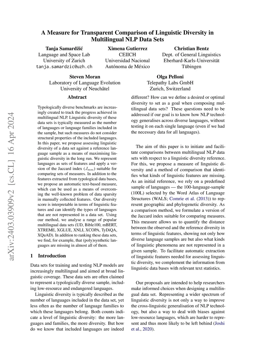 Typologically diverse benchmarks are increasingly created to track the progress achieved in multilingual NLP. Linguistic diversity of these data sets is typically measured as the number of languages or language families included in the sample, but such measures do not consider structural properties of the included languages. In this paper, we propose assessing linguistic diversity of a data set against a reference language sample as a means of maximising linguistic diversity in the long run. We represent languages as sets of features and apply a version of the Jaccard index suitable for comparing sets of measures. In addition to the features extracted from typological data bases, we propose an automatic text-based measure, which can be used as a means of overcoming the well-known problem of data sparsity in manually collected features. Our diversity score is interpretable in terms of linguistic features and can identify the types of languages that are not represented in a data set. Using our method, we analyse a range of popular multilingual data sets (UD, Bible100, mBERT, XTREME, XGLUE, XNLI, XCOPA, TyDiQA, XQuAD). In addition to ranking these data sets, we find, for example, that (poly)synthetic languages are missing in almost all of them.