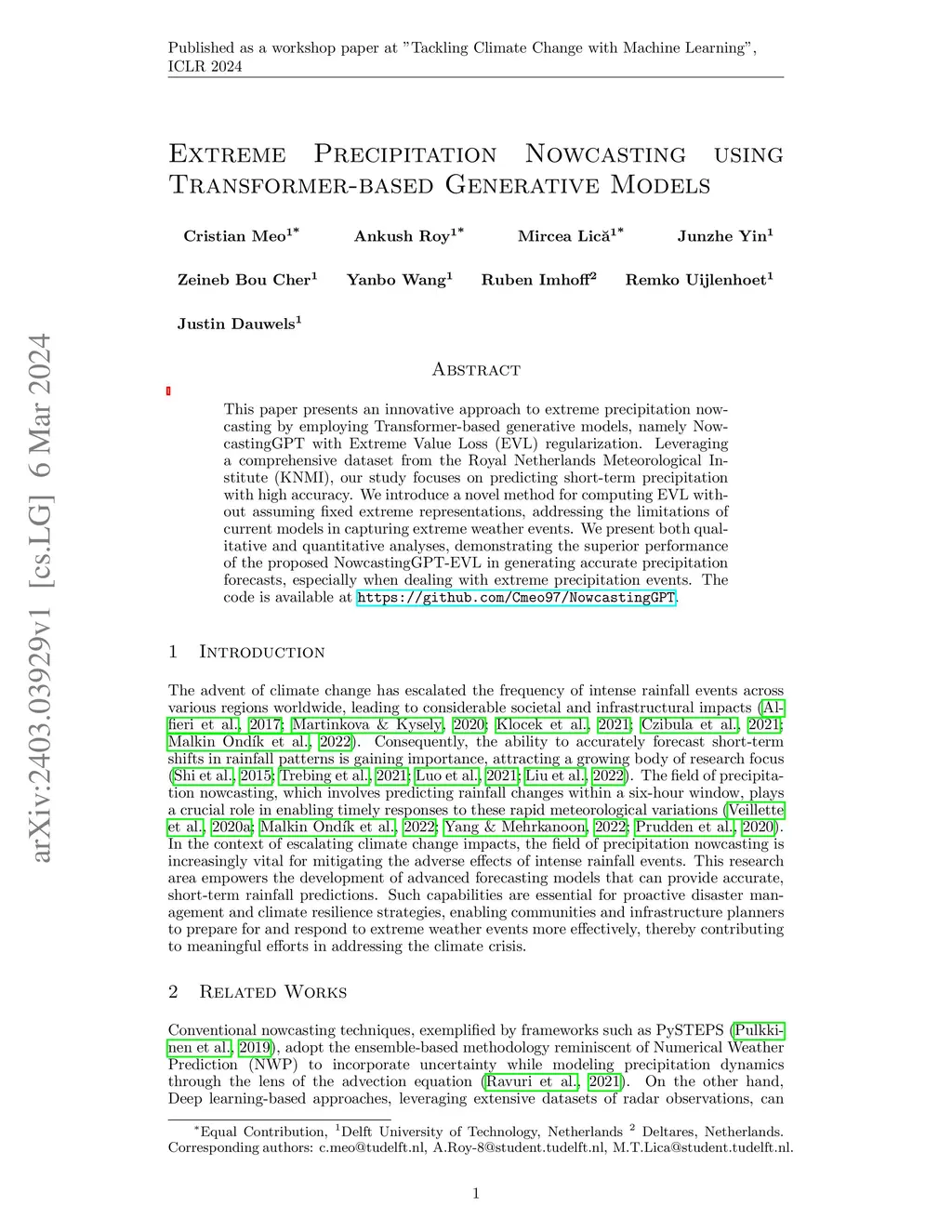 This paper presents an innovative approach to extreme precipitation nowcasting by employing Transformer-based generative models, namely NowcastingGPT with Extreme Value Loss (EVL) regularization. Leveraging a comprehensive dataset from the Royal Netherlands Meteorological Institute (KNMI), our study focuses on predicting short-term precipitation with high accuracy. We introduce a novel method for computing EVL without assuming fixed extreme representations, addressing the limitations of current models in capturing extreme weather events. We present both qualitative and quantitative analyses, demonstrating the superior performance of the proposed NowcastingGPT-EVL in generating accurate precipitation forecasts, especially when dealing with extreme precipitation events. The code is available at \url{https://github.com/Cmeo97/NowcastingGPT}.