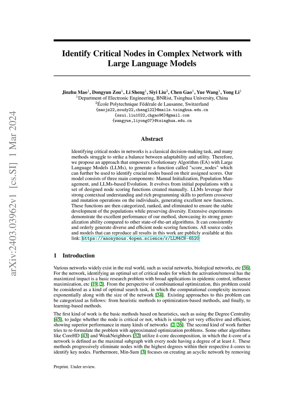 Identifying critical nodes in networks is a classical decision-making task, and many methods struggle to strike a balance between adaptability and utility. Therefore, we propose an approach that empowers Evolutionary Algorithm (EA) with Large Language Models (LLMs), to generate a function called "score\_nodes" which can further be used to identify crucial nodes based on their assigned scores. Our model consists of three main components: Manual Initialization, Population Management, and LLMs-based Evolution. It evolves from initial populations with a set of designed node scoring functions created manually. LLMs leverage their strong contextual understanding and rich programming skills to perform crossover and mutation operations on the individuals, generating excellent new functions. These functions are then categorized, ranked, and eliminated to ensure the stable development of the populations while preserving diversity. Extensive experiments demonstrate the excellent performance of our method, showcasing its strong generalization ability compared to other state-of-the-art algorithms. It can consistently and orderly generate diverse and efficient node scoring functions. All source codes and models that can reproduce all results in this work are publicly available at this link: \url{https://anonymous.4open.science/r/LLM4CN-6520}