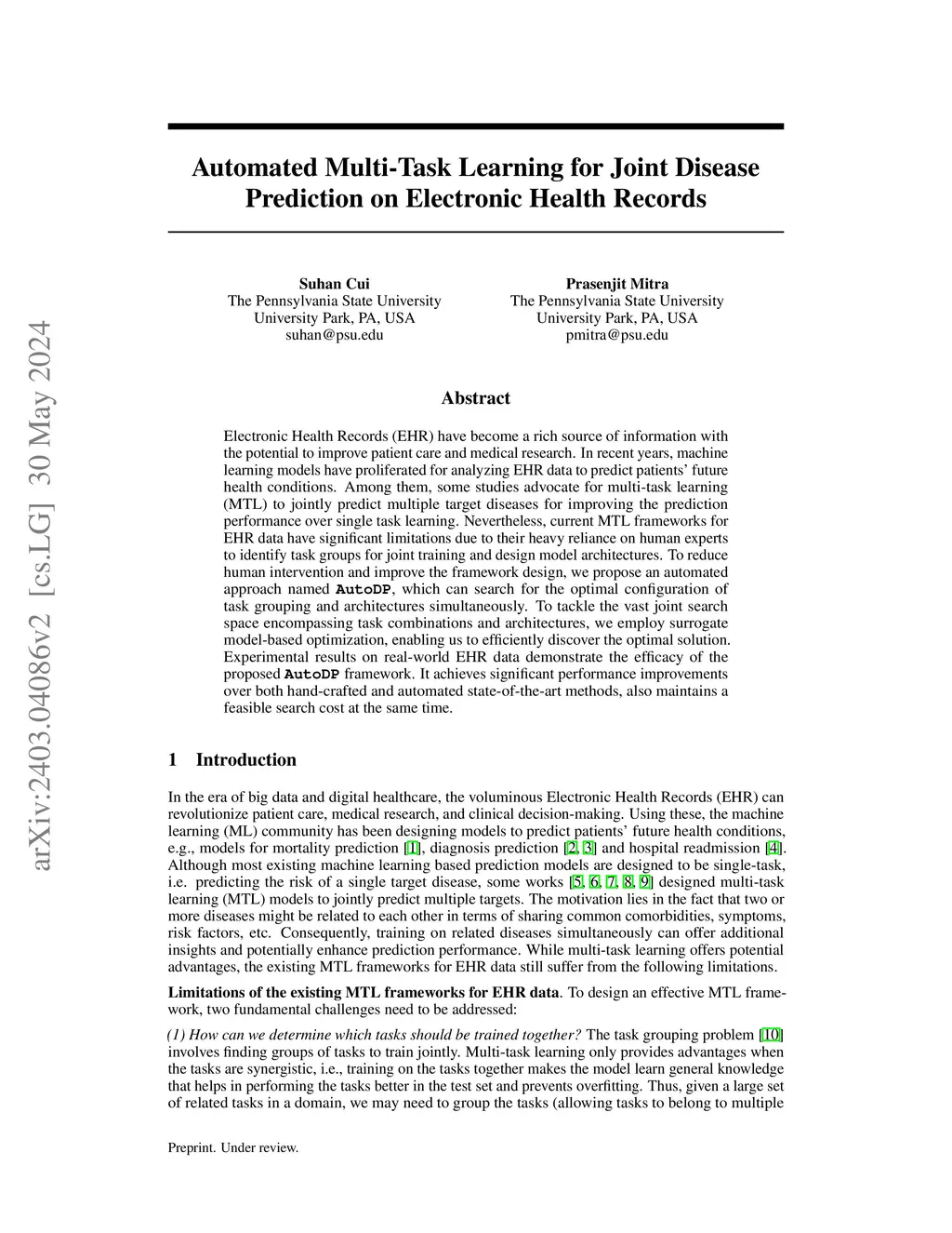 In the realm of big data and digital healthcare, Electronic Health Records (EHR) have become a rich source of information with the potential to improve patient care and medical research. In recent years, machine learning models have proliferated for analyzing EHR data to predict patients future health conditions. Among them, some studies advocate for multi-task learning (MTL) to jointly predict multiple target diseases for improving the prediction performance over single task learning. Nevertheless, current MTL frameworks for EHR data have significant limitations due to their heavy reliance on human experts to identify task groups for joint training and design model architectures. To reduce human intervention and improve the framework design, we propose an automated approach named AutoDP, which can search for the optimal configuration of task grouping and architectures simultaneously. To tackle the vast joint search space encompassing task combinations and architectures, we employ surrogate model-based optimization, enabling us to efficiently discover the optimal solution. Experimental results on real-world EHR data demonstrate the efficacy of the proposed AutoDP framework. It achieves significant performance improvements over both hand-crafted and automated state-of-the-art methods, also maintains a feasible search cost at the same time.