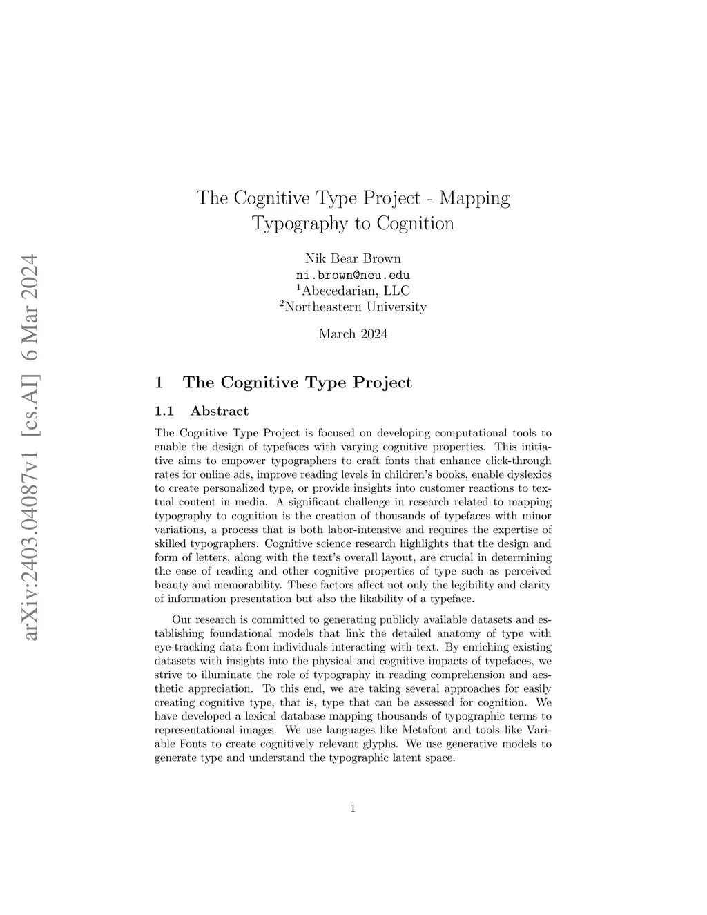 The Cognitive Type Project is focused on developing computational tools to enable the design of typefaces with varying cognitive properties. This initiative aims to empower typographers to craft fonts that enhance click-through rates for online ads, improve reading levels in children's books, enable dyslexics to create personalized type, or provide insights into customer reactions to textual content in media. A significant challenge in research related to mapping typography to cognition is the creation of thousands of typefaces with minor variations, a process that is both labor-intensive and requires the expertise of skilled typographers. Cognitive science research highlights that the design and form of letters, along with the text's overall layout, are crucial in determining the ease of reading and other cognitive properties of type such as perceived beauty and memorability. These factors affect not only the legibility and clarity of information presentation but also the likability of a typeface.