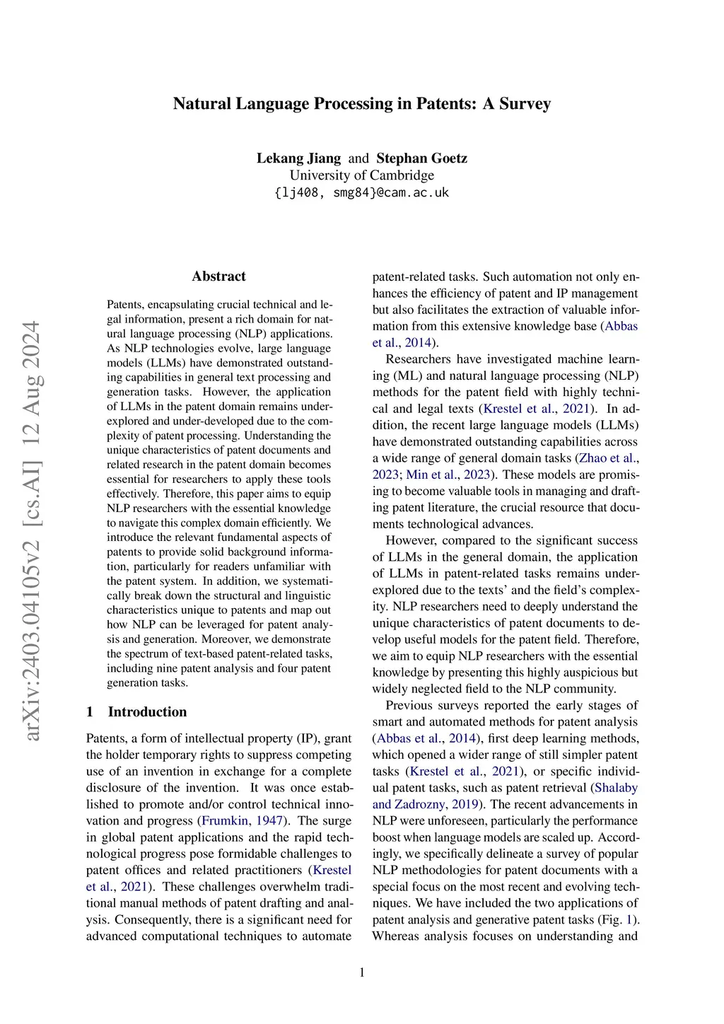 Patents, which encapsulate crucial technical and legal information in text form and referenced drawings, present a rich domain for natural language processing (NLP) applications. As NLP technologies evolve, large language models (LLMs) have demonstrated outstanding capabilities in general text processing and generation tasks. However, the application of LLMs in the patent domain remains under-explored and under-developed due to the complexity of patents, particularly their language and legal framework. Understanding the unique characteristics of patent documents and related research in the patent domain becomes essential for researchers to apply these tools effectively. Therefore, this paper aims to equip NLP researchers with the essential knowledge to navigate this complex domain efficiently. We introduce the relevant fundamental aspects of patents to provide solid background information. In addition, we systematically break down the structural and linguistic characteristics unique to patents and map out how NLP can be leveraged for patent analysis and generation. Moreover, we demonstrate the spectrum of text-based and multimodal patent-related tasks, including nine patent analysis and four patent generation tasks.