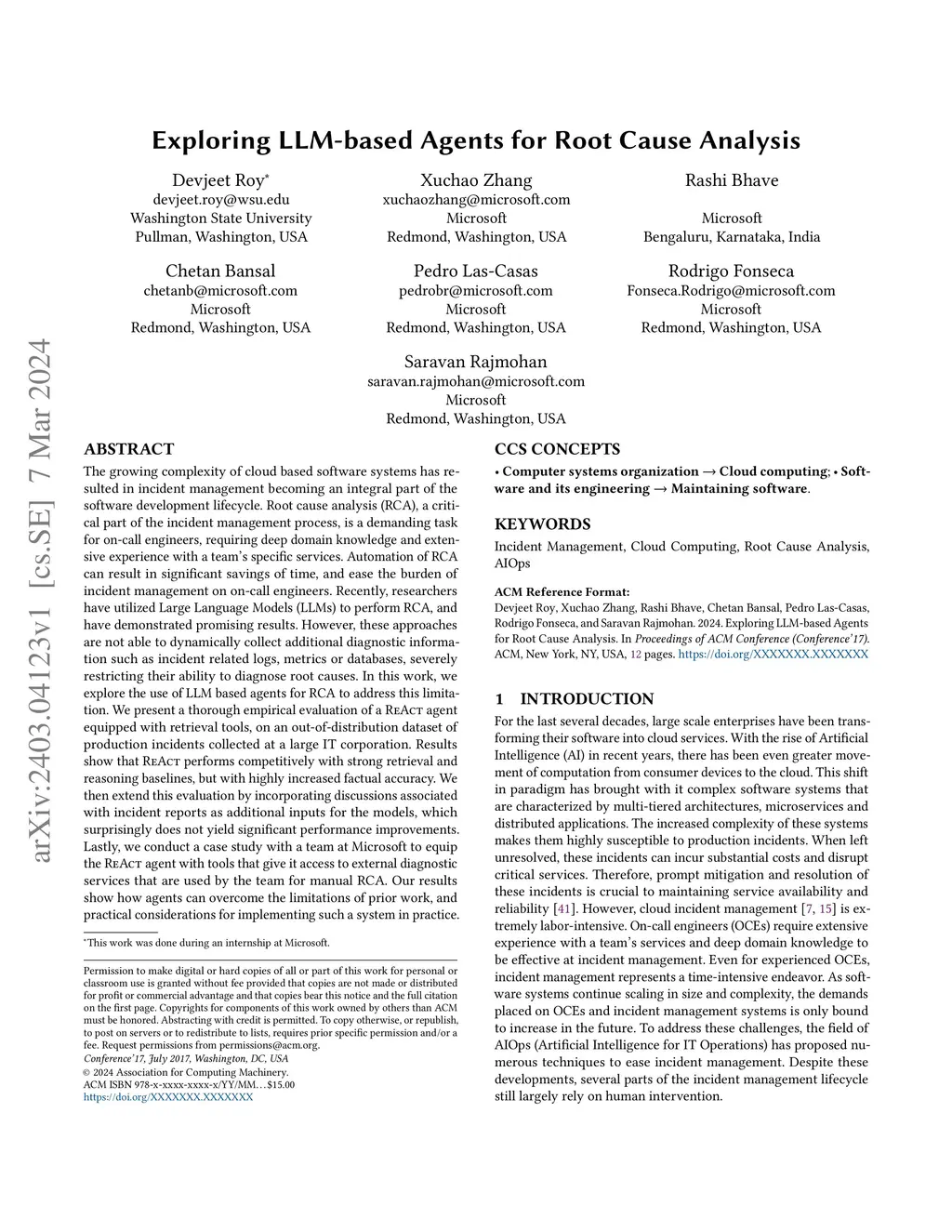 The growing complexity of cloud based software systems has resulted in incident management becoming an integral part of the software development lifecycle. Root cause analysis (RCA), a critical part of the incident management process, is a demanding task for on-call engineers, requiring deep domain knowledge and extensive experience with a team's specific services. Automation of RCA can result in significant savings of time, and ease the burden of incident management on on-call engineers. Recently, researchers have utilized Large Language Models (LLMs) to perform RCA, and have demonstrated promising results. However, these approaches are not able to dynamically collect additional diagnostic information such as incident related logs, metrics or databases, severely restricting their ability to diagnose root causes. In this work, we explore the use of LLM based agents for RCA to address this limitation. We present a thorough empirical evaluation of a ReAct agent equipped with retrieval tools, on an out-of-distribution dataset of production incidents collected at Microsoft. Results show that ReAct performs competitively with strong retrieval and reasoning baselines, but with highly increased factual accuracy. We then extend this evaluation by incorporating discussions associated with incident reports as additional inputs for the models, which surprisingly does not yield significant performance improvements. Lastly, we conduct a case study with a team at Microsoft to equip the ReAct agent with tools that give it access to external diagnostic services that are used by the team for manual RCA. Our results show how agents can overcome the limitations of prior work, and practical considerations for implementing such a system in practice.