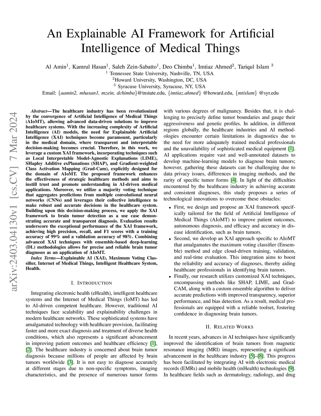 The healthcare industry has been revolutionized by the convergence of Artificial Intelligence of Medical Things (AIoMT), allowing advanced data-driven solutions to improve healthcare systems. With the increasing complexity of Artificial Intelligence (AI) models, the need for Explainable Artificial Intelligence (XAI) techniques become paramount, particularly in the medical domain, where transparent and interpretable decision-making becomes crucial. Therefore, in this work, we leverage a custom XAI framework, incorporating techniques such as Local Interpretable Model-Agnostic Explanations (LIME), SHapley Additive exPlanations (SHAP), and Gradient-weighted Class Activation Mapping (Grad-Cam), explicitly designed for the domain of AIoMT. The proposed framework enhances the effectiveness of strategic healthcare methods and aims to instill trust and promote understanding in AI-driven medical applications. Moreover, we utilize a majority voting technique that aggregates predictions from multiple convolutional neural networks (CNNs) and leverages their collective intelligence to make robust and accurate decisions in the healthcare system. Building upon this decision-making process, we apply the XAI framework to brain tumor detection as a use case demonstrating accurate and transparent diagnosis. Evaluation results underscore the exceptional performance of the XAI framework, achieving high precision, recall, and F1 scores with a training accuracy of 99% and a validation accuracy of 98%. Combining advanced XAI techniques with ensemble-based deep-learning (DL) methodologies allows for precise and reliable brain tumor diagnoses as an application of AIoMT.