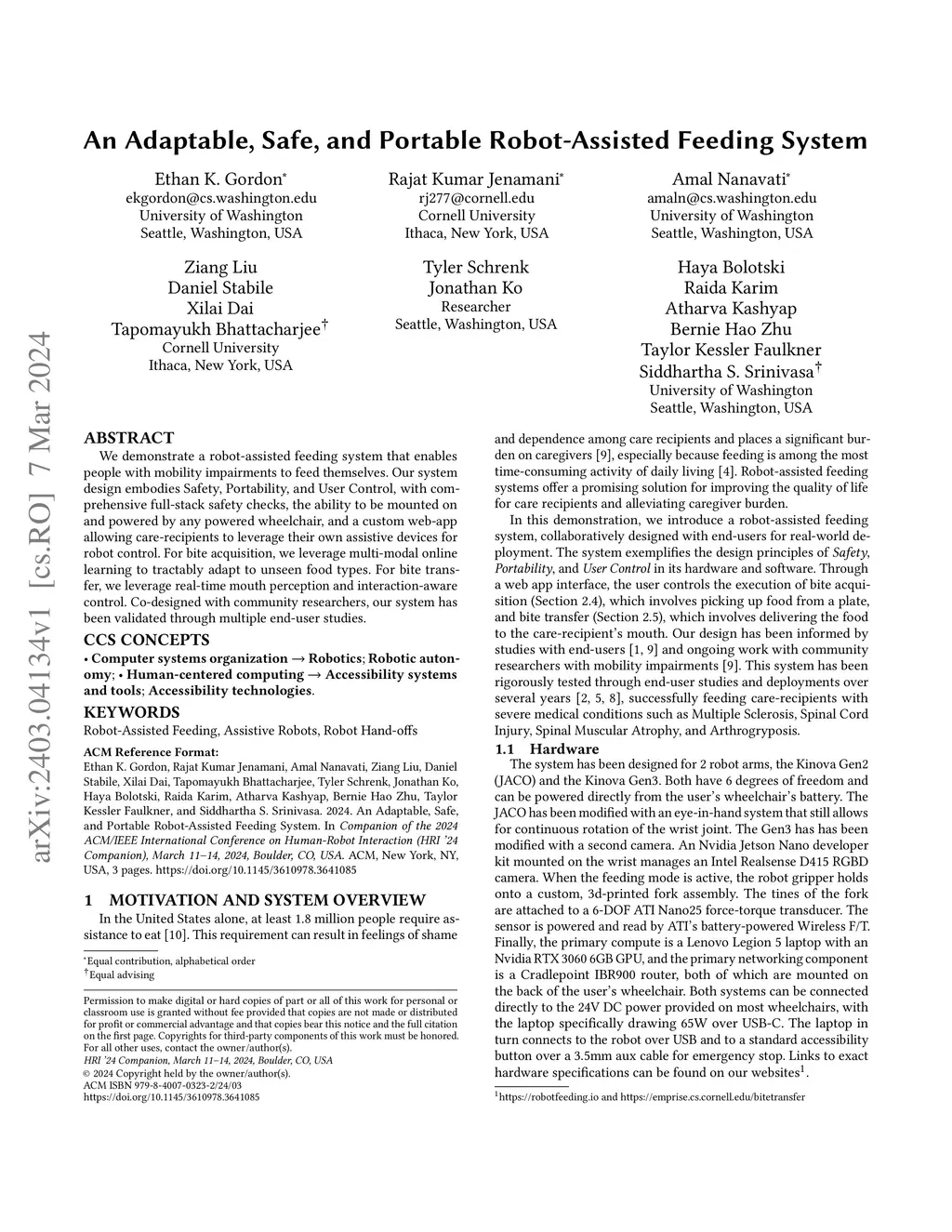 We demonstrate a robot-assisted feeding system that enables people with mobility impairments to feed themselves. Our system design embodies Safety, Portability, and User Control, with comprehensive full-stack safety checks, the ability to be mounted on and powered by any powered wheelchair, and a custom web-app allowing care-recipients to leverage their own assistive devices for robot control. For bite acquisition, we leverage multi-modal online learning to tractably adapt to unseen food types. For bite transfer, we leverage real-time mouth perception and interaction-aware control. Co-designed with community researchers, our system has been validated through multiple end-user studies.