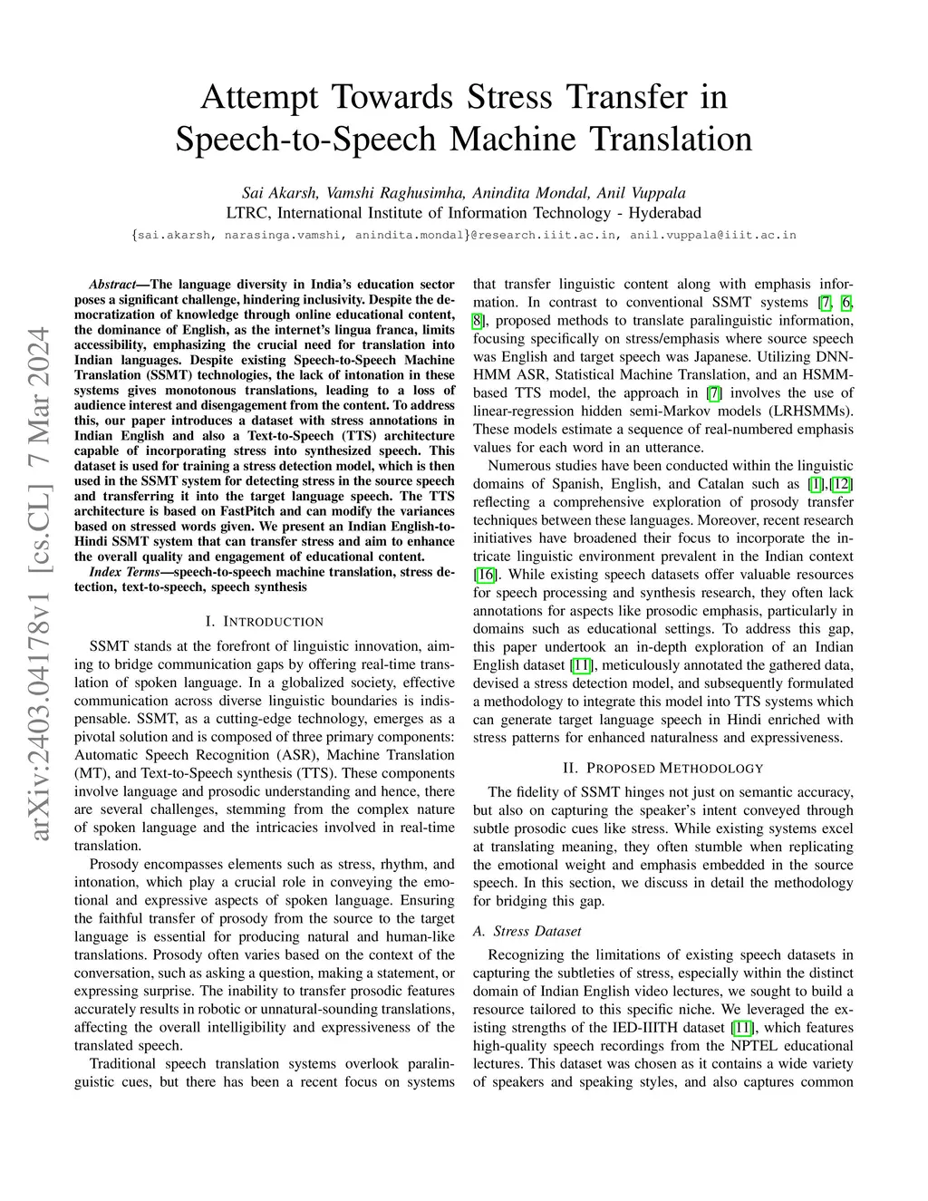 The language diversity in India's education sector poses a significant challenge, hindering inclusivity. Despite the democratization of knowledge through online educational content, the dominance of English, as the internet's lingua franca, limits accessibility, emphasizing the crucial need for translation into Indian languages. Despite existing Speech-to-Speech Machine Translation (SSMT) technologies, the lack of intonation in these systems gives monotonous translations, leading to a loss of audience interest and disengagement from the content. To address this, our paper introduces a dataset with stress annotations in Indian English and also a Text-to-Speech (TTS) architecture capable of incorporating stress into synthesized speech. This dataset is used for training a stress detection model, which is then used in the SSMT system for detecting stress in the source speech and transferring it into the target language speech. The TTS architecture is based on FastPitch and can modify the variances based on stressed words given. We present an Indian English-to-Hindi SSMT system that can transfer stress and aim to enhance the overall quality and engagement of educational content.
