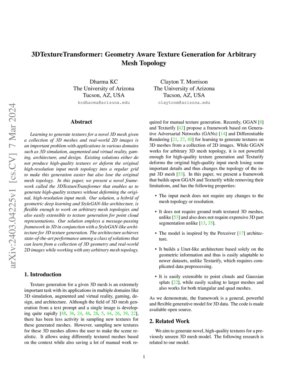 Learning to generate textures for a novel 3D mesh given a collection of 3D meshes and real-world 2D images is an important problem with applications in various domains such as 3D simulation, augmented and virtual reality, gaming, architecture, and design. Existing solutions either do not produce high-quality textures or deform the original high-resolution input mesh topology into a regular grid to make this generation easier but also lose the original mesh topology. In this paper, we present a novel framework called the 3DTextureTransformer that enables us to generate high-quality textures without deforming the original, high-resolution input mesh. Our solution, a hybrid of geometric deep learning and StyleGAN-like architecture, is flexible enough to work on arbitrary mesh topologies and also easily extensible to texture generation for point cloud representations. Our solution employs a message-passing framework in 3D in conjunction with a StyleGAN-like architecture for 3D texture generation. The architecture achieves state-of-the-art performance among a class of solutions that can learn from a collection of 3D geometry and real-world 2D images while working with any arbitrary mesh topology.