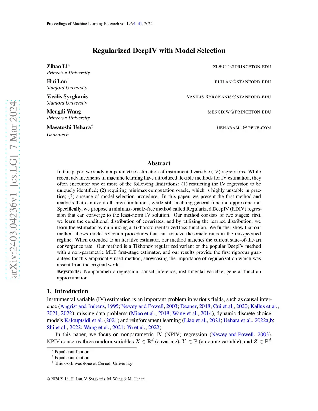 In this paper, we study nonparametric estimation of instrumental variable (IV) regressions. While recent advancements in machine learning have introduced flexible methods for IV estimation, they often encounter one or more of the following limitations: (1) restricting the IV regression to be uniquely identified; (2) requiring minimax computation oracle, which is highly unstable in practice; (3) absence of model selection procedure. In this paper, we present the first method and analysis that can avoid all three limitations, while still enabling general function approximation. Specifically, we propose a minimax-oracle-free method called Regularized DeepIV (RDIV) regression that can converge to the least-norm IV solution. Our method consists of two stages: first, we learn the conditional distribution of covariates, and by utilizing the learned distribution, we learn the estimator by minimizing a Tikhonov-regularized loss function. We further show that our method allows model selection procedures that can achieve the oracle rates in the misspecified regime. When extended to an iterative estimator, our method matches the current state-of-the-art convergence rate. Our method is a Tikhonov regularized variant of the popular DeepIV method with a non-parametric MLE first-stage estimator, and our results provide the first rigorous guarantees for this empirically used method, showcasing the importance of regularization which was absent from the original work.